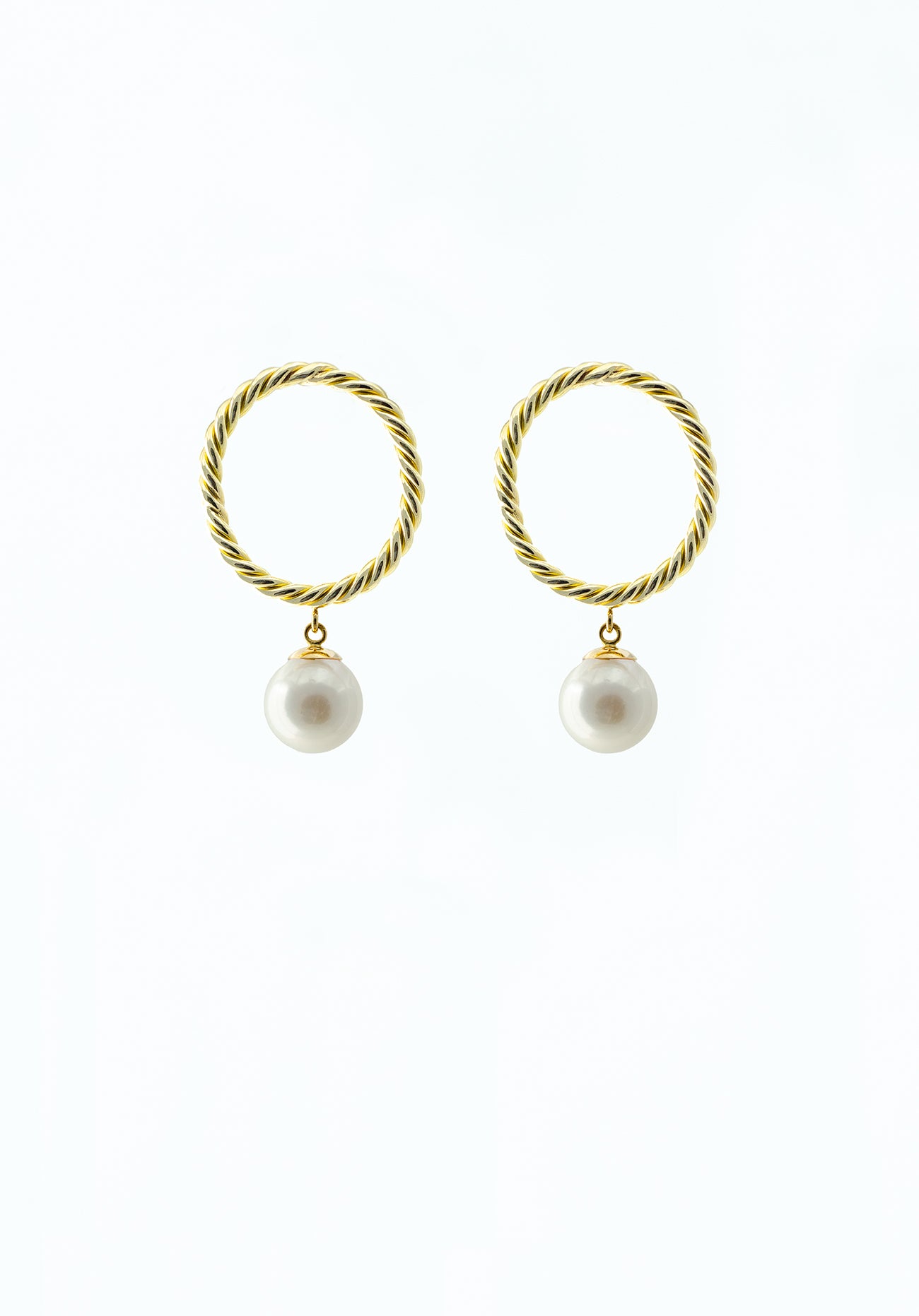 - A hand-twisted gold oval shape paired with dangling Akoya pearls measuring 8mm in diameter. The oval shape is approx. 3/4" x 5/8" (2x2.2cm). Size Chart