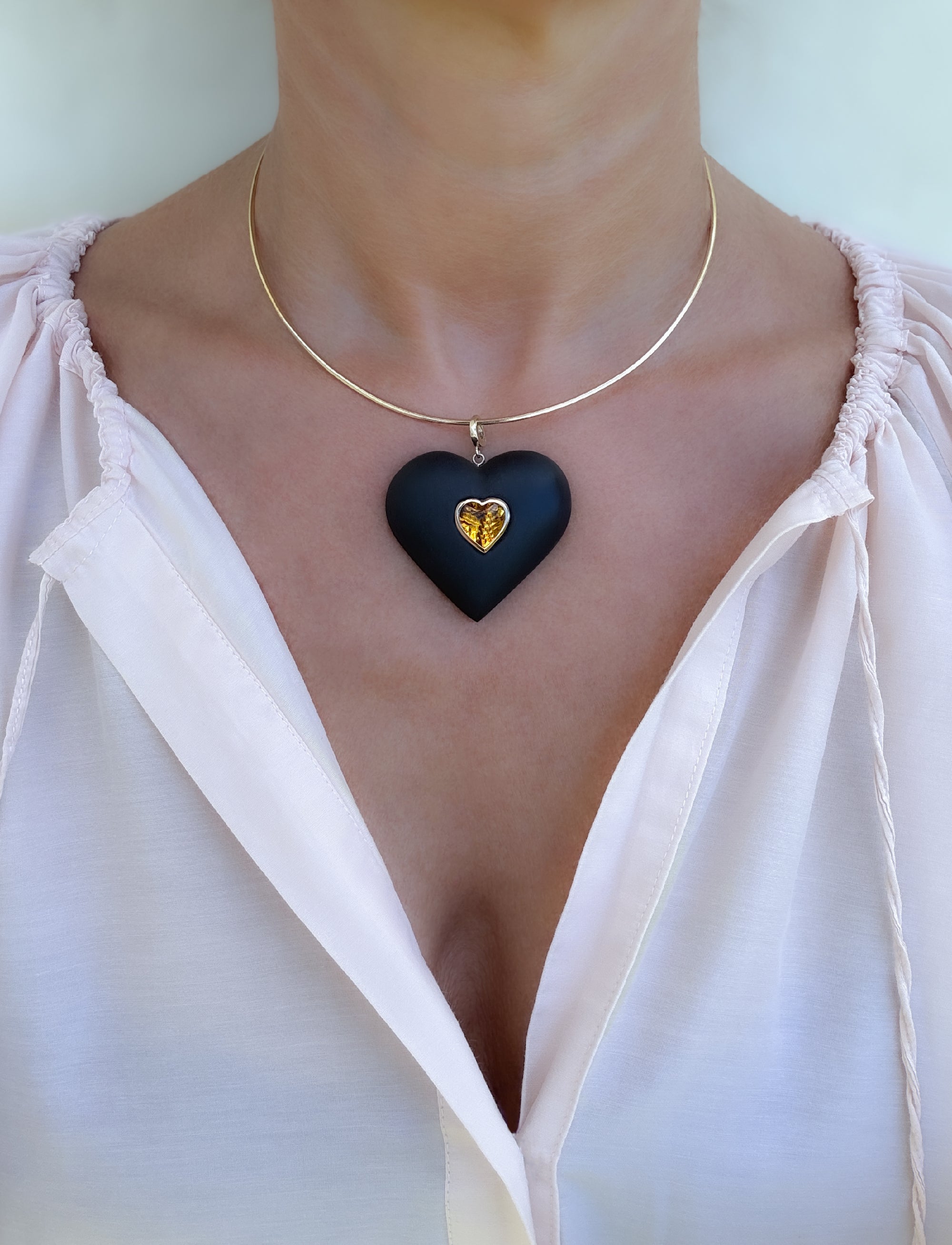 - This pendant features ebony wood paired with a heart-shaped citrine, set in 14k gold. It includes a 14k gold push clasp bail for flexible attachment options. The ebony heart measures approx. 1 5/8" x 1 1/2" (45mm x 40mm). The pendant doesn't come with a chain. Size Chart