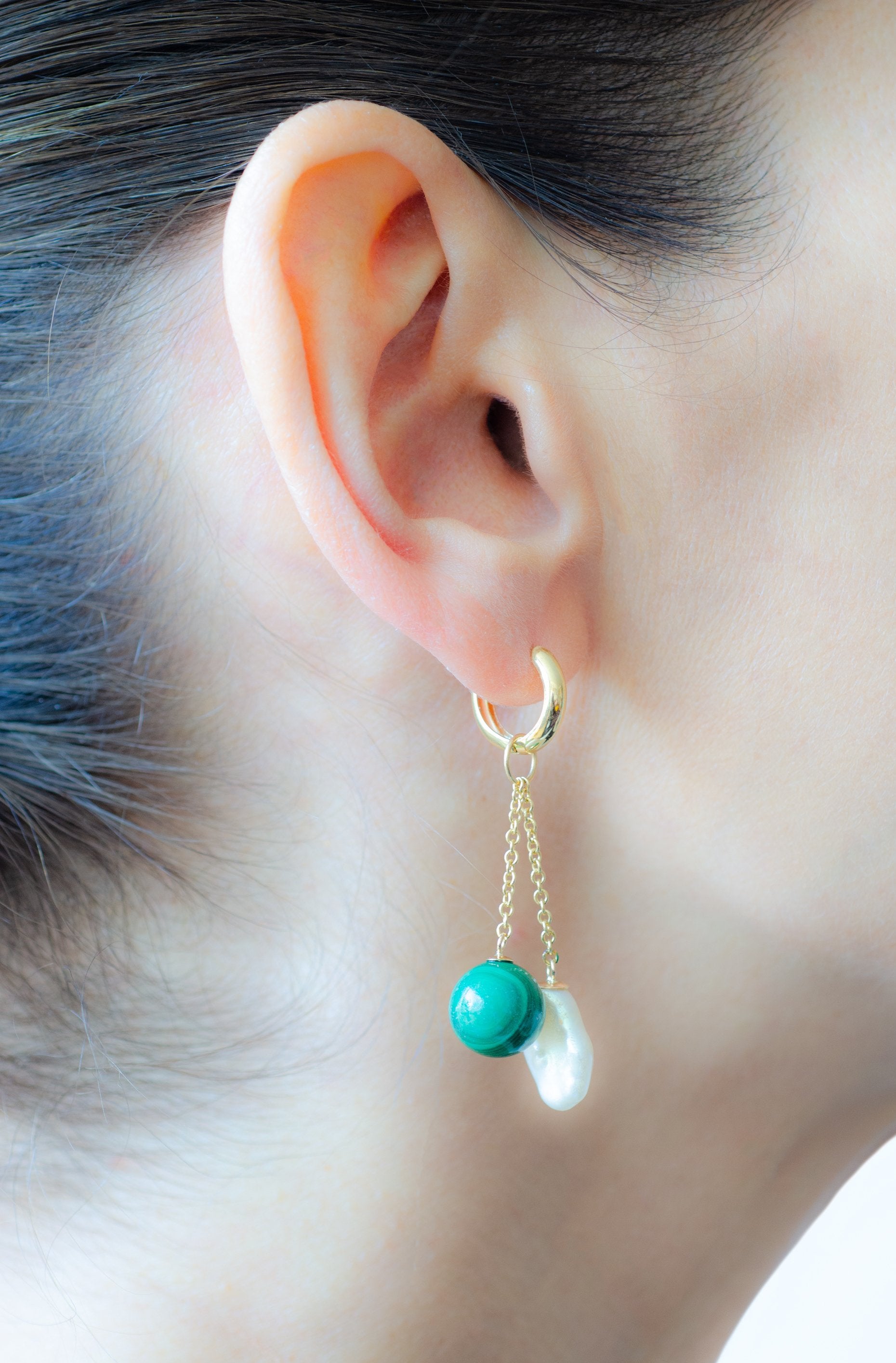 - Hoop earrings with hanging fresh water pearls & malachite balls. The gold hoops can be worn without the charms. The earrings measures 2" long. Size Chart