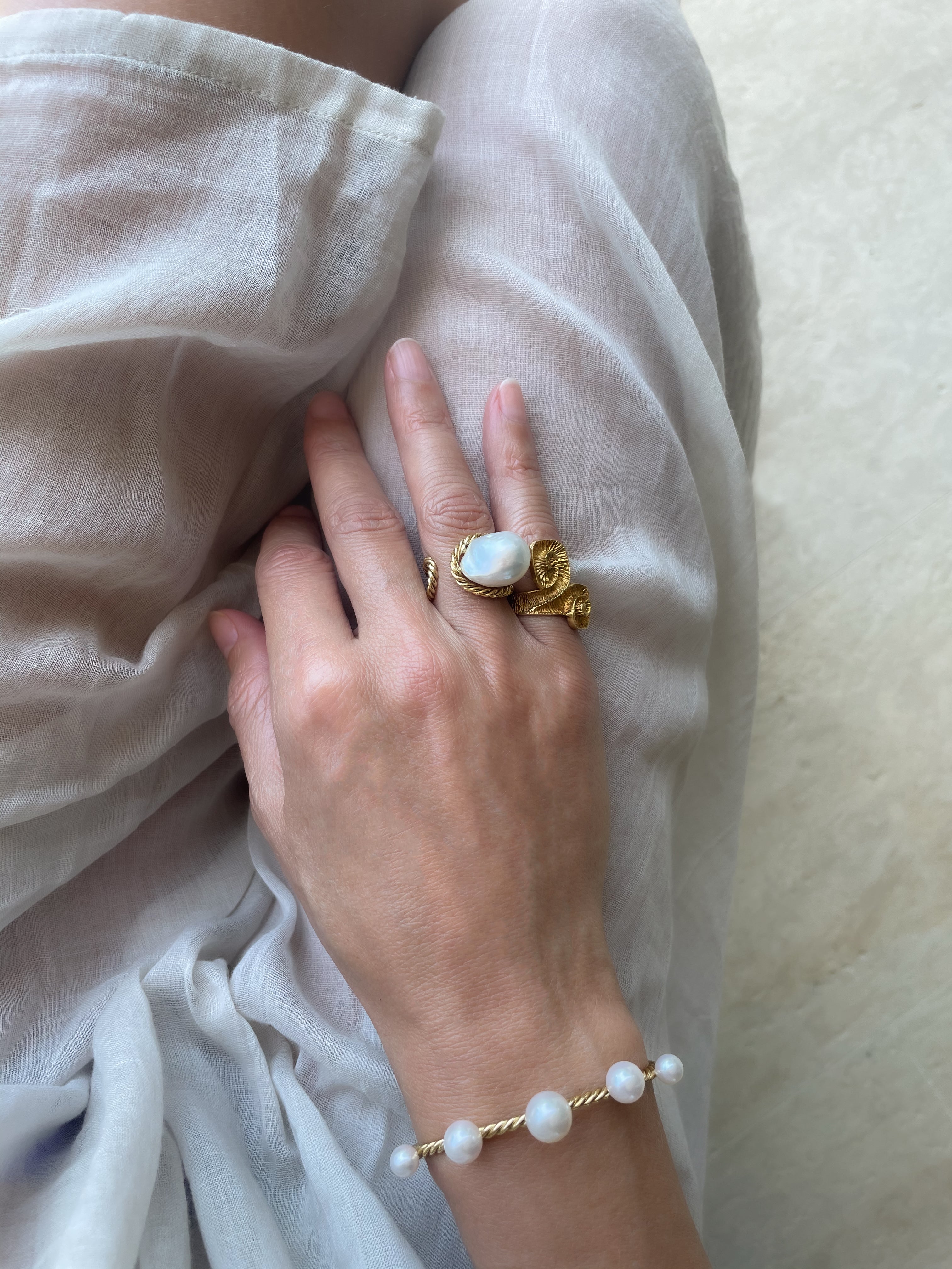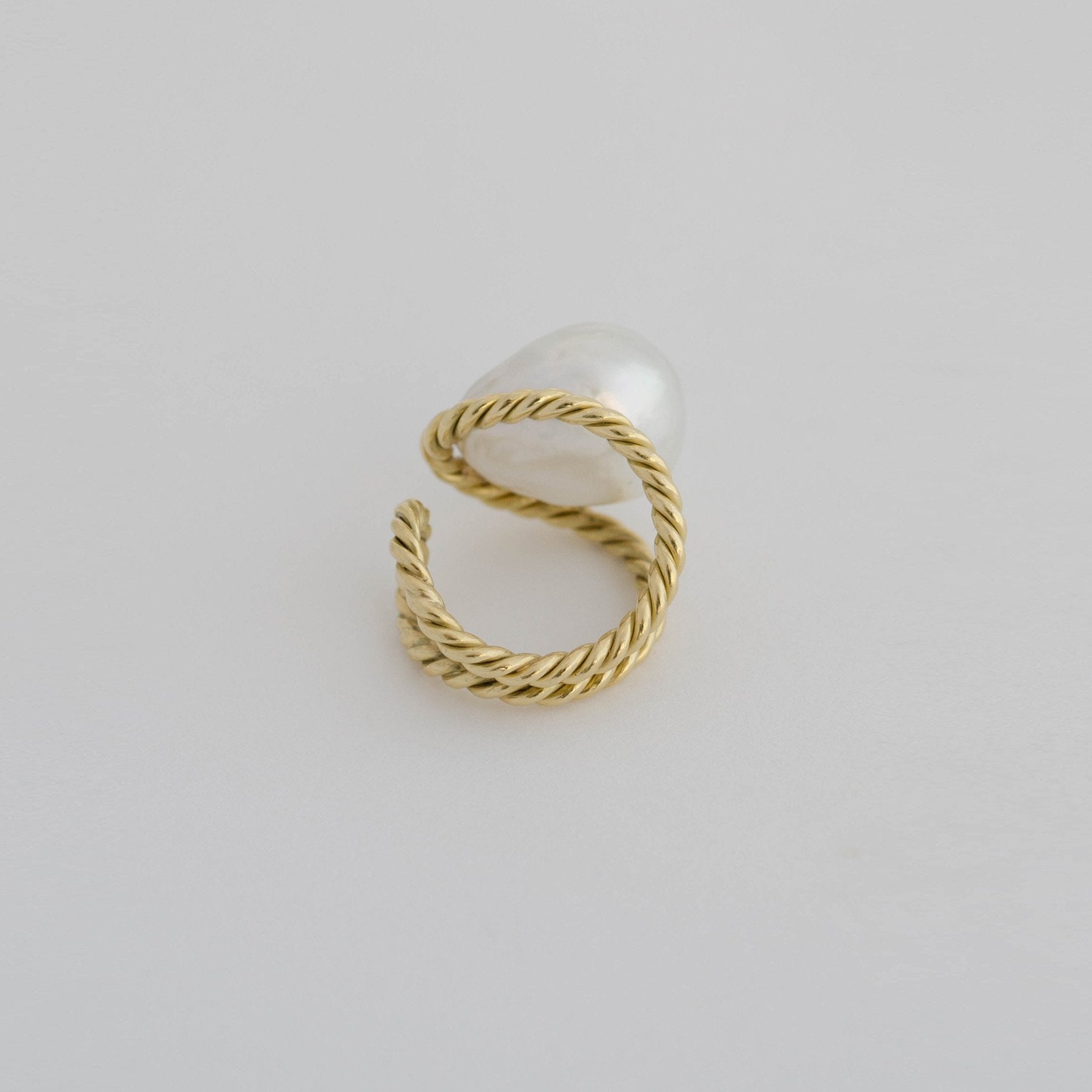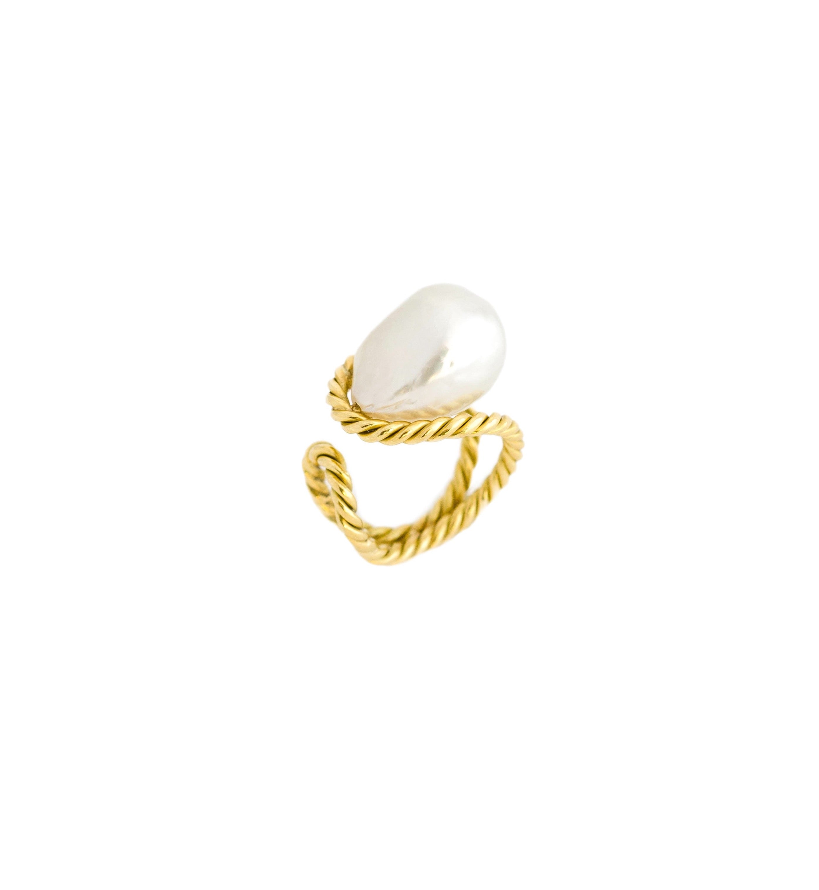 - Hand twisted 18k yellow gold wire in a double curved open shank ring paired with a white South Sea Baroque pearl which measures approx. 13mm. The ring measures 3/4" x 1 1/4". No two baroque pearls are alike and although we intend to preserve consistency each pearl is unique. Size Chart
