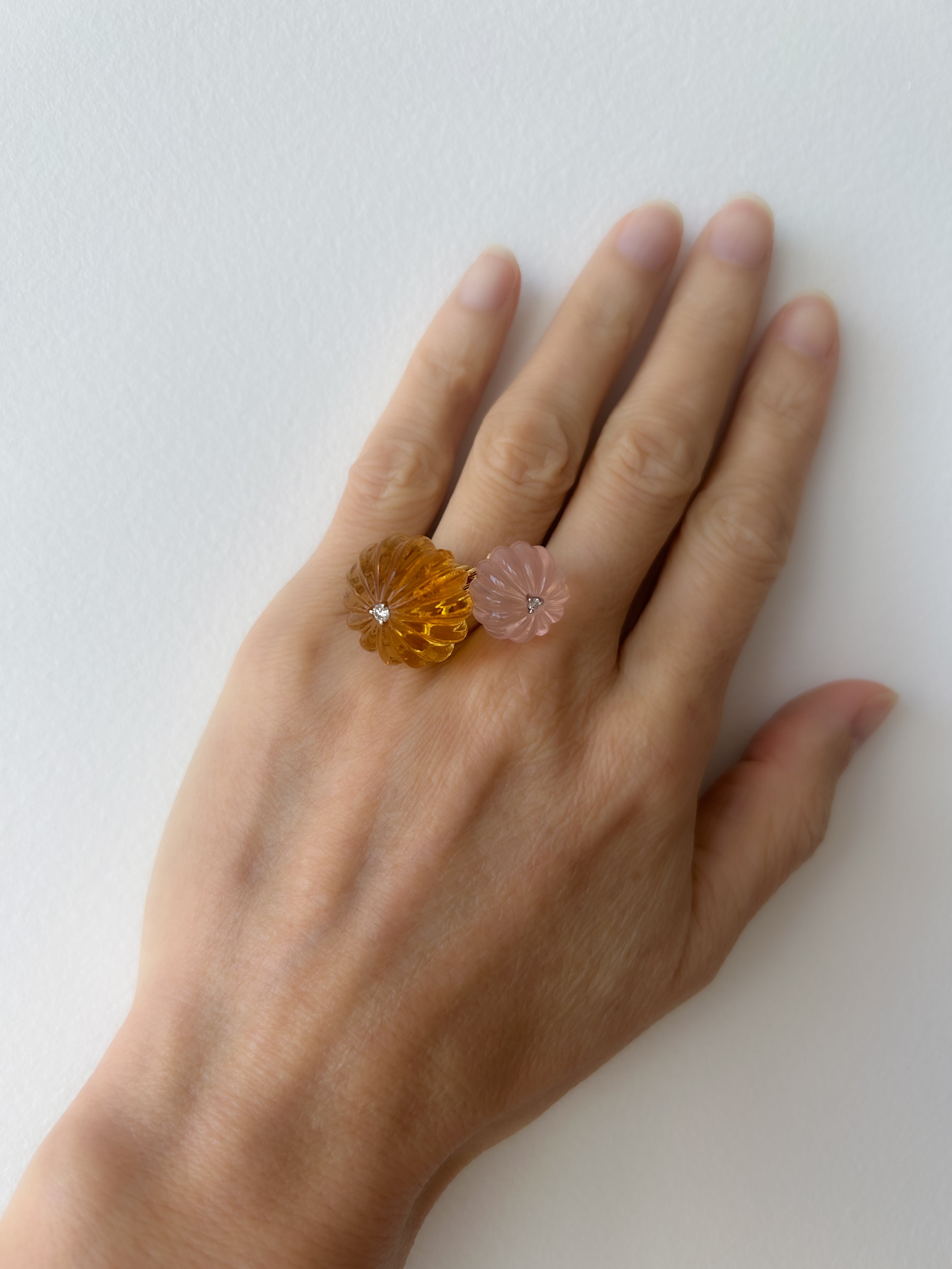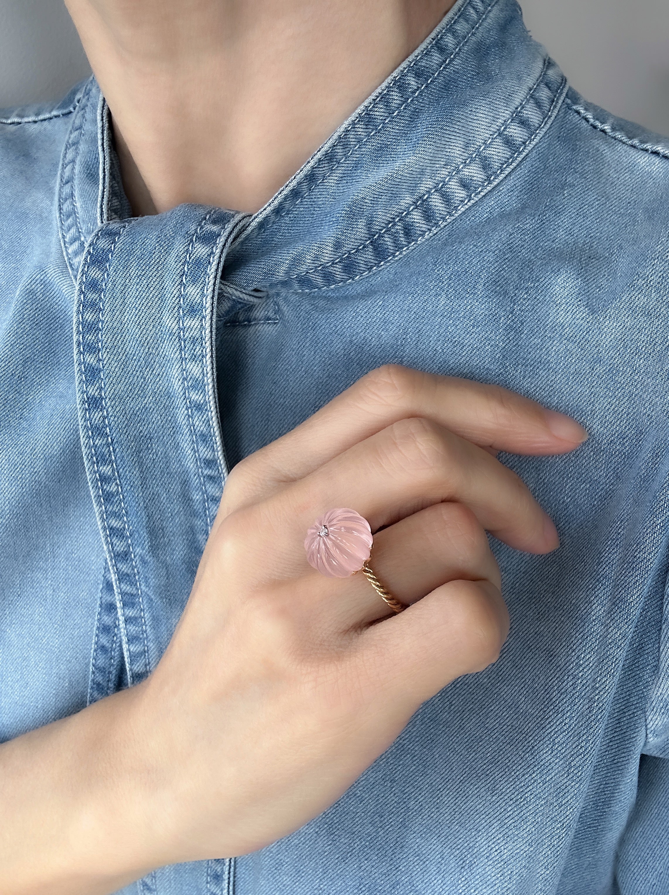 Our fluted rings come in multi-colors and sizes and can be stacked or worn alone. 18k yellow gold Rose quartz & diamond Available in 6.5 Designed in NYC Style #010202 Size & Fit A hand-twisted band holds a fluted rose...Read more