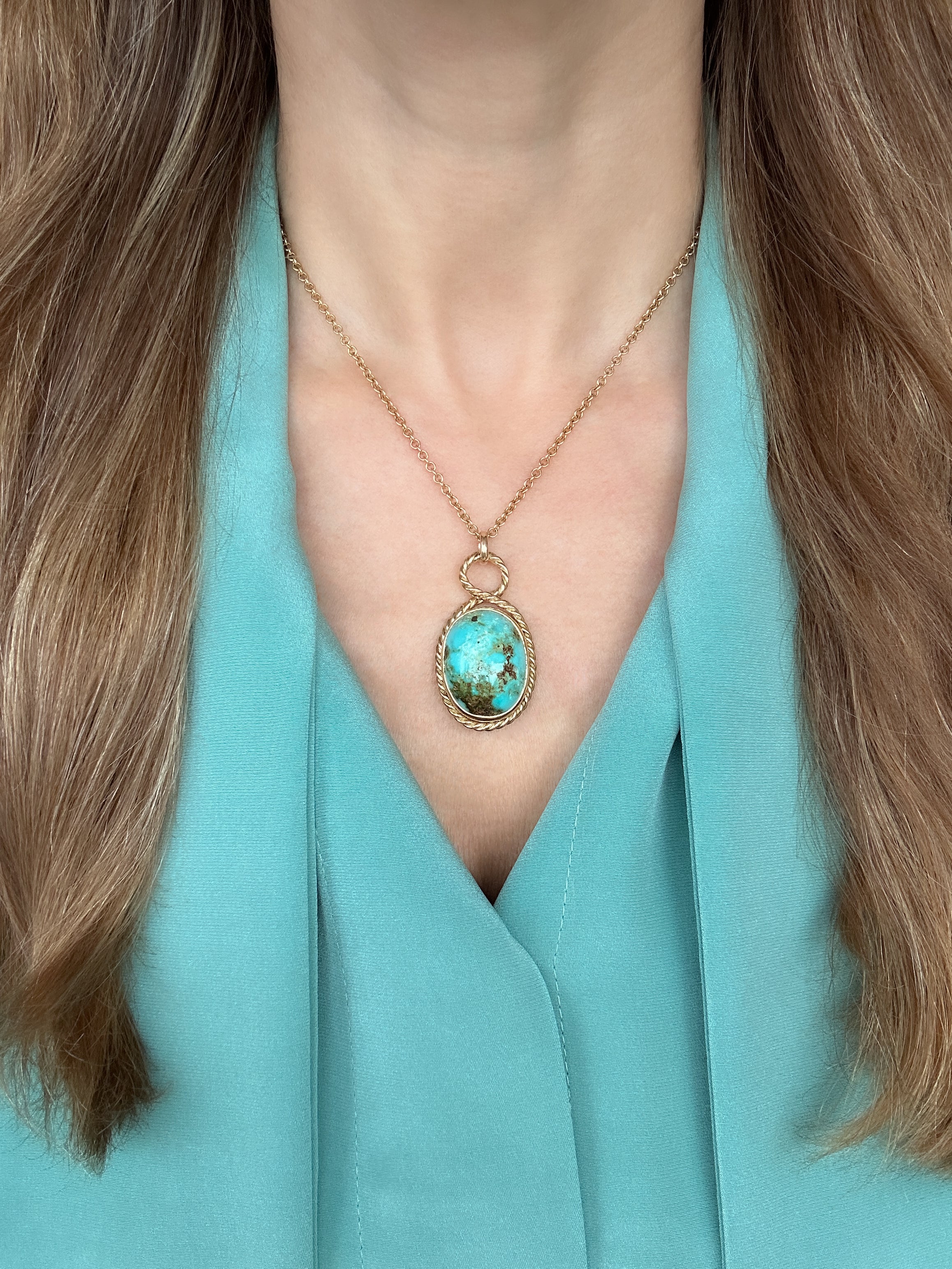 - The turquoise cabochon is set in a 18k gold bezel wrapped in a hand-twisted gold frame in the shape of an infinity sign. The pendant is approx. 1 7/8" x 1" (4.75cmx2.5cm). The pendant comes without the chain. Size Chart