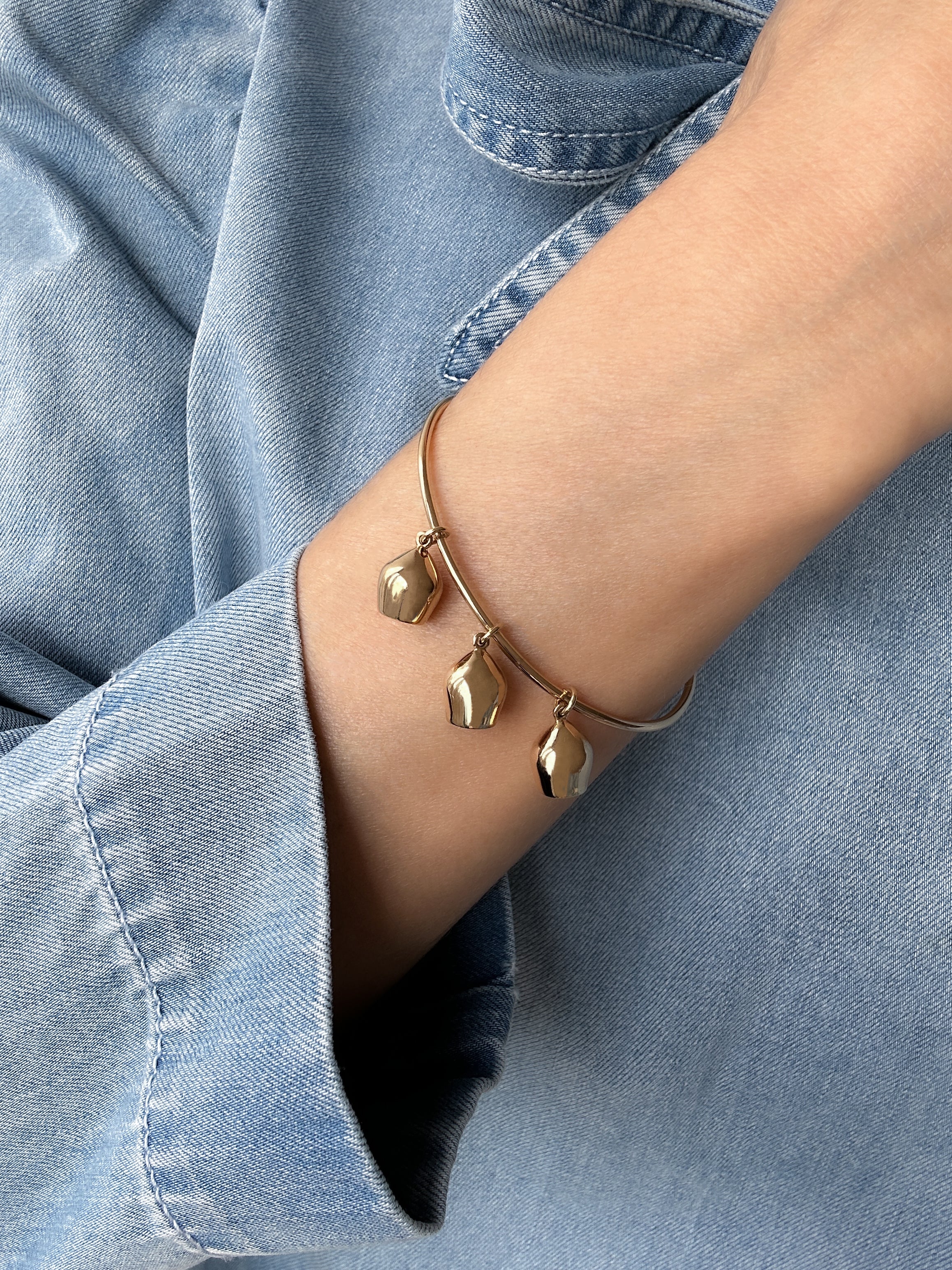Open shank wire cuff paired with 3 dangling Lune charms. The center Lune charm is pavé with 14 diamond on its face. The charms measure ≈ 9/16"x3/8"(14mmx9.4mm). Size Chart