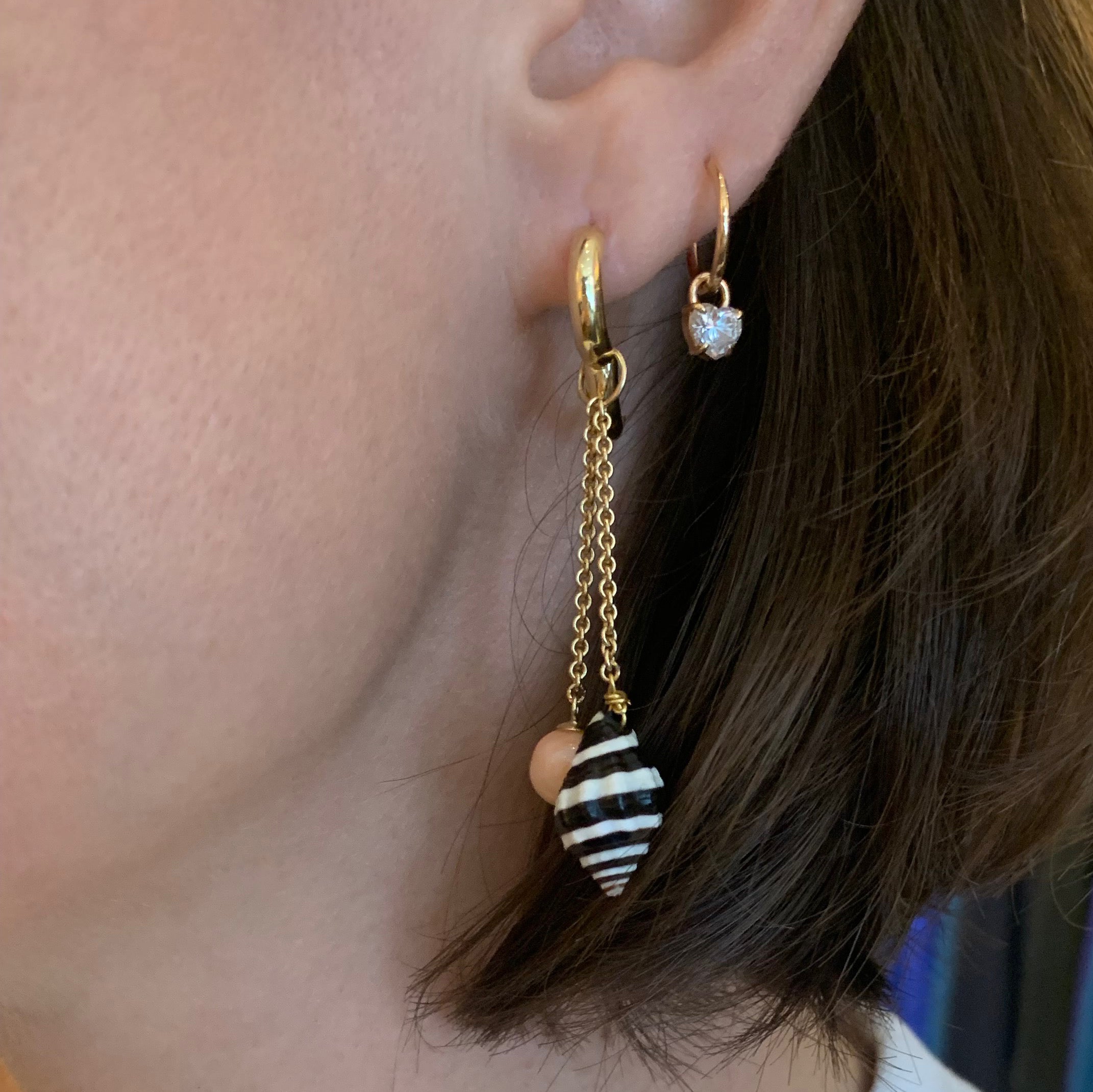 Live a charmed life with these playful Les Charmantes hoops with dangling charms. 18k yellow gold Natural coral, shell Available Designed in NYC Style #020204-P Size & Fit Hoops earring with hanging coral beads and shell. The gold hoops...Read more
