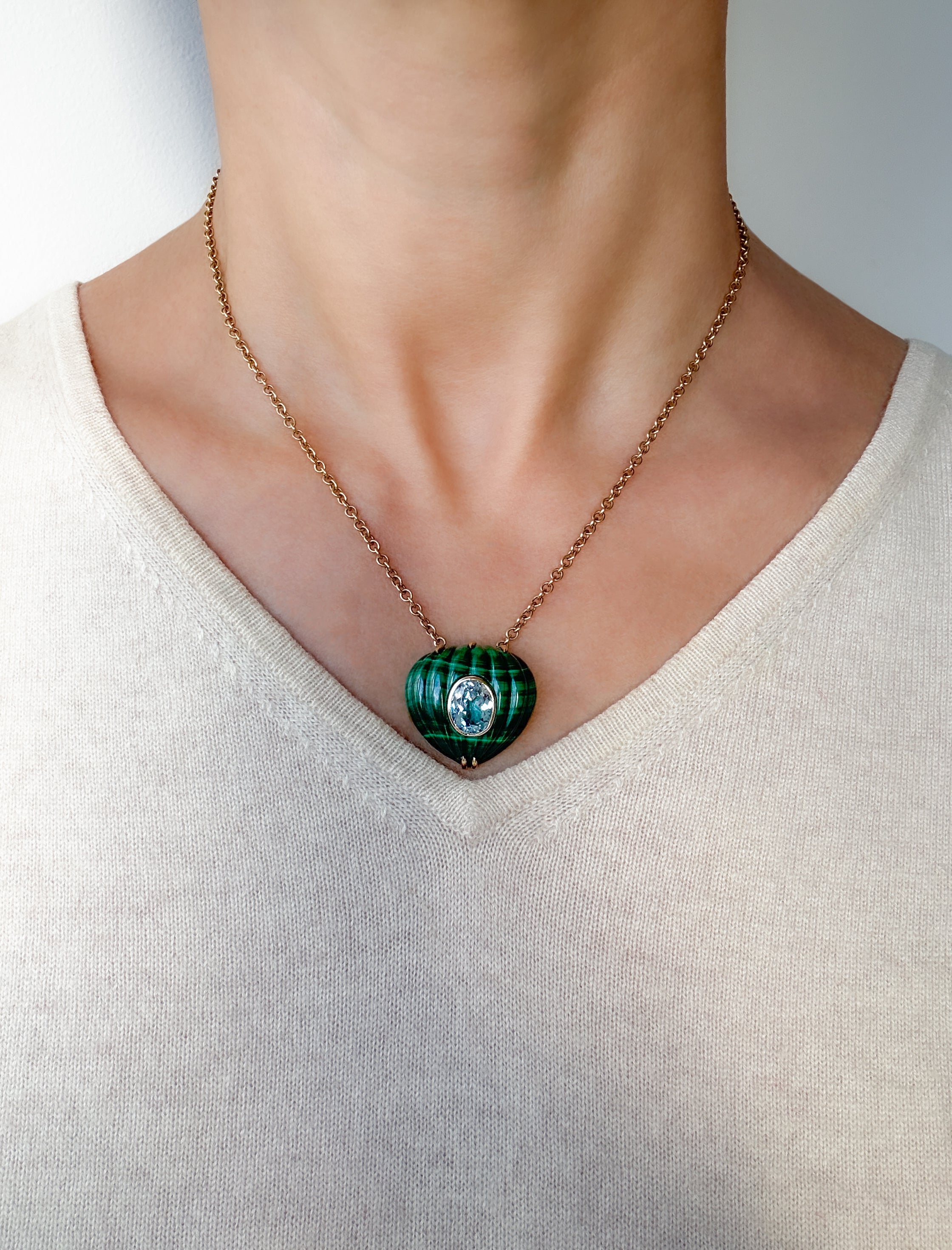 Celebrate love with Malachite a stone of transformation and joy. 18k yellow gold Malachite Blue topaz Available Hand carved in NYC Style #030401 Size & Fit The hand carved malachite heart measures approx. 1" x 7/8" (25mm x 23mm)...Read more