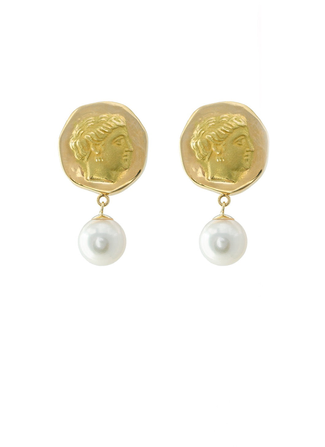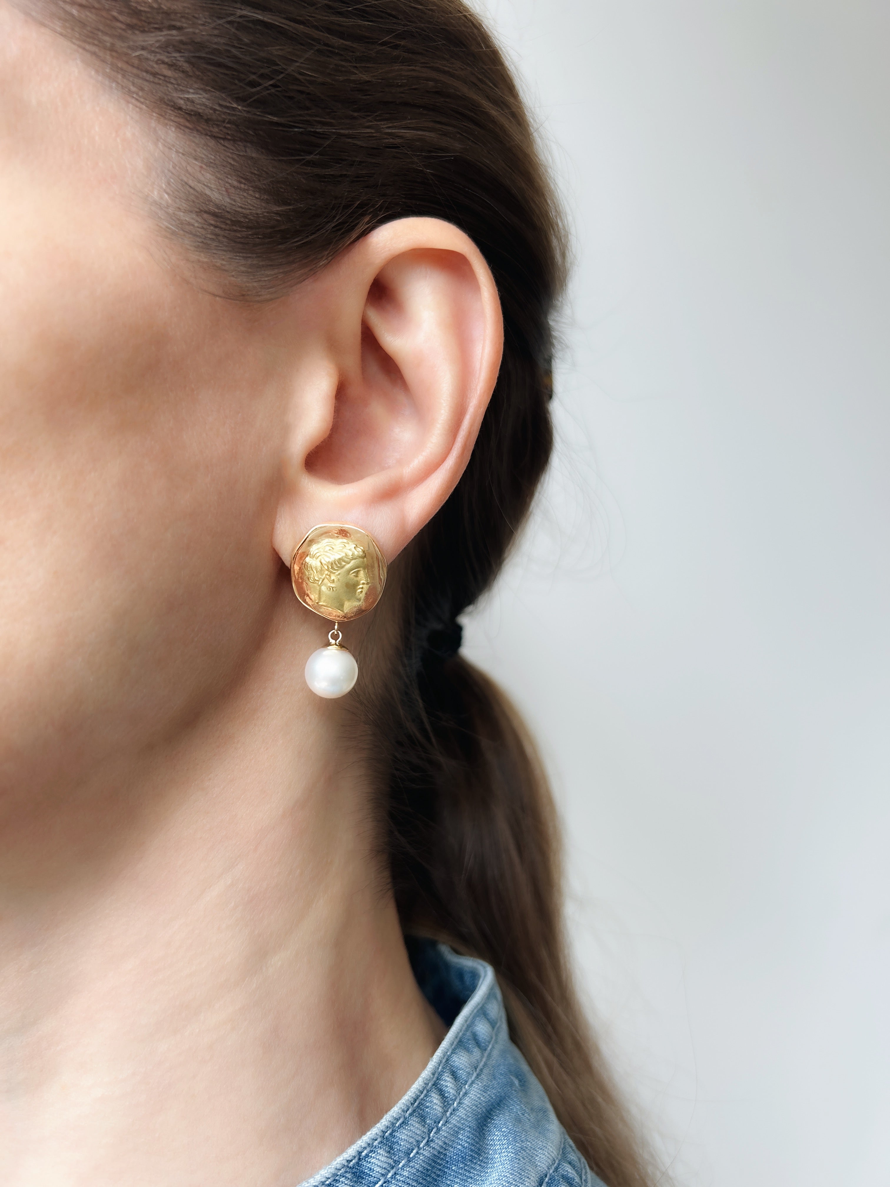 The Andromeda faces crafted in 18k gold measure in diameter 0.7" (17mm). The dangling Akoya pearls measure 8.5mm. The total length is 1.25" (30mm). Size Chart