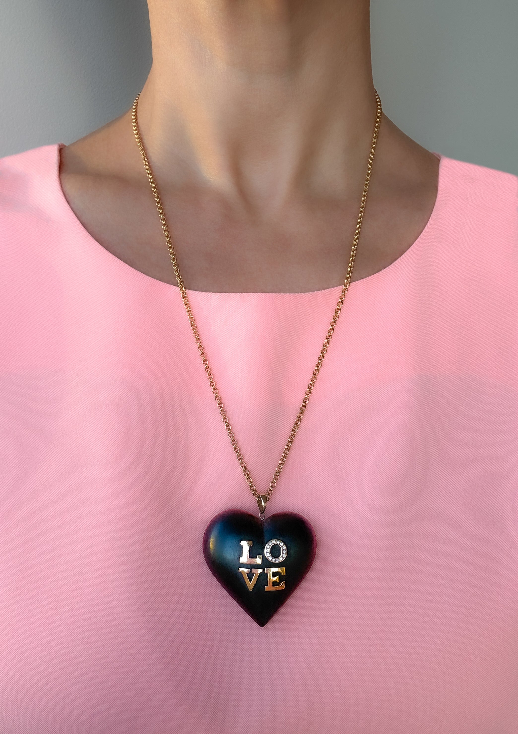 - ThIS ebony wood heart is paired with 14k gold LOVE letters. The letter O is pavé-set with 14 diamonds. The heart measures approx. 1 5/8" x 1 1/2" (45mm x 40mm). The pendant doesn't come with a chain. Size Chart
