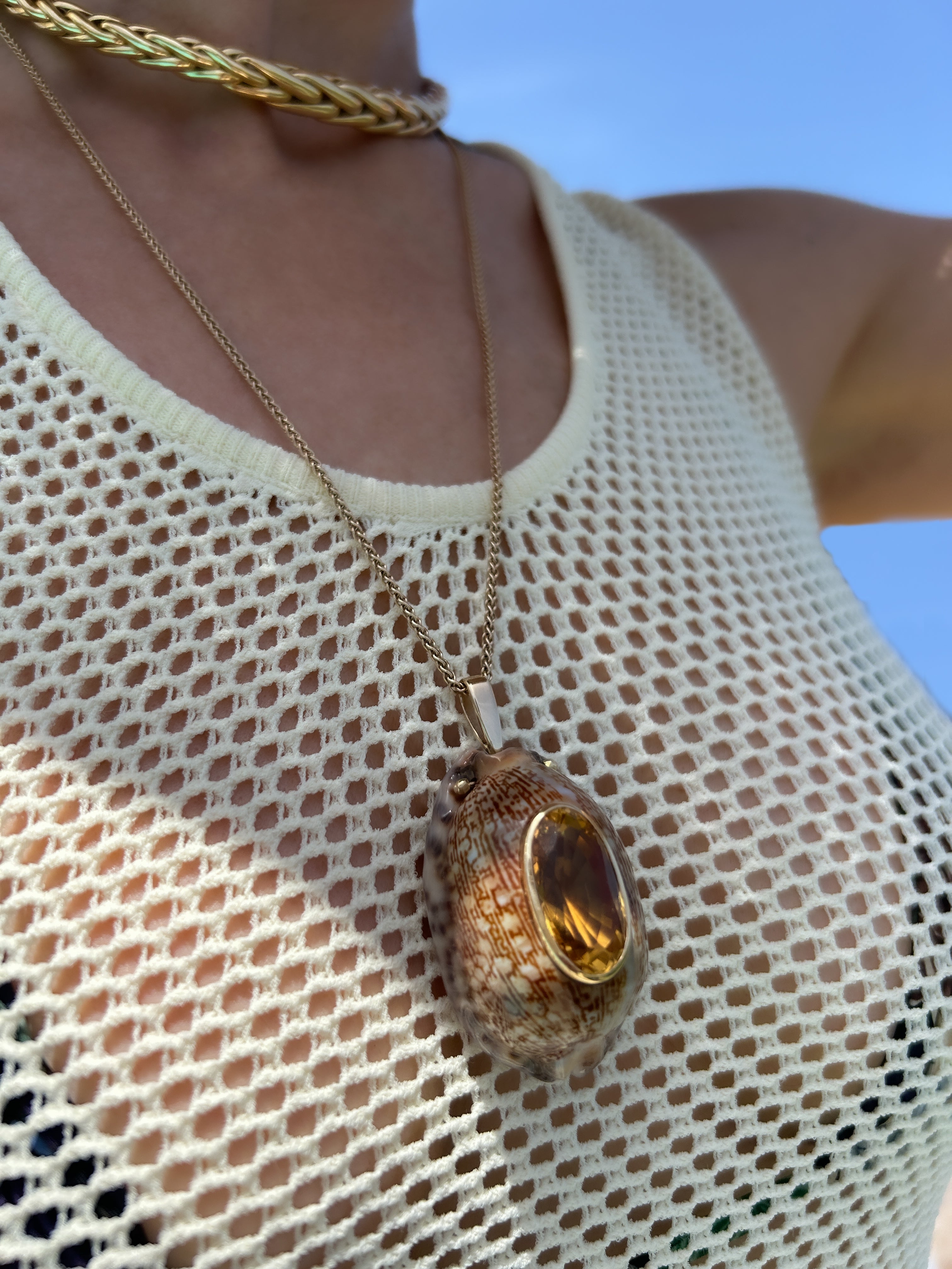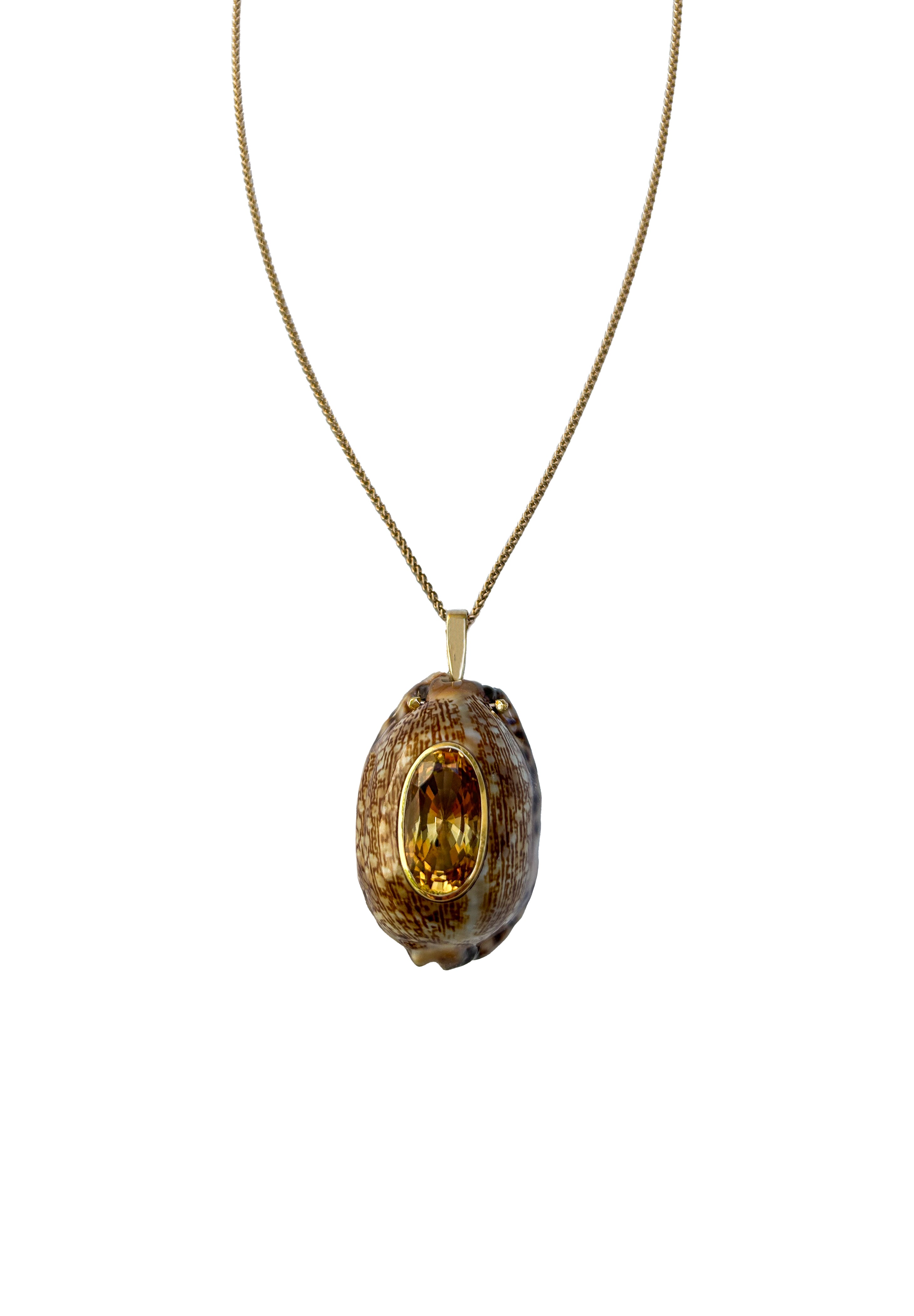 - A tiger cowrie (Cypraea Tigris) paired with a central oval citrine set in a gold bezel hangs from a gold bail. The 14k gold wheat style chain measures 22" (56cm) long and can be worn with other pendants. The total length is 26" (66cm). Size Chart