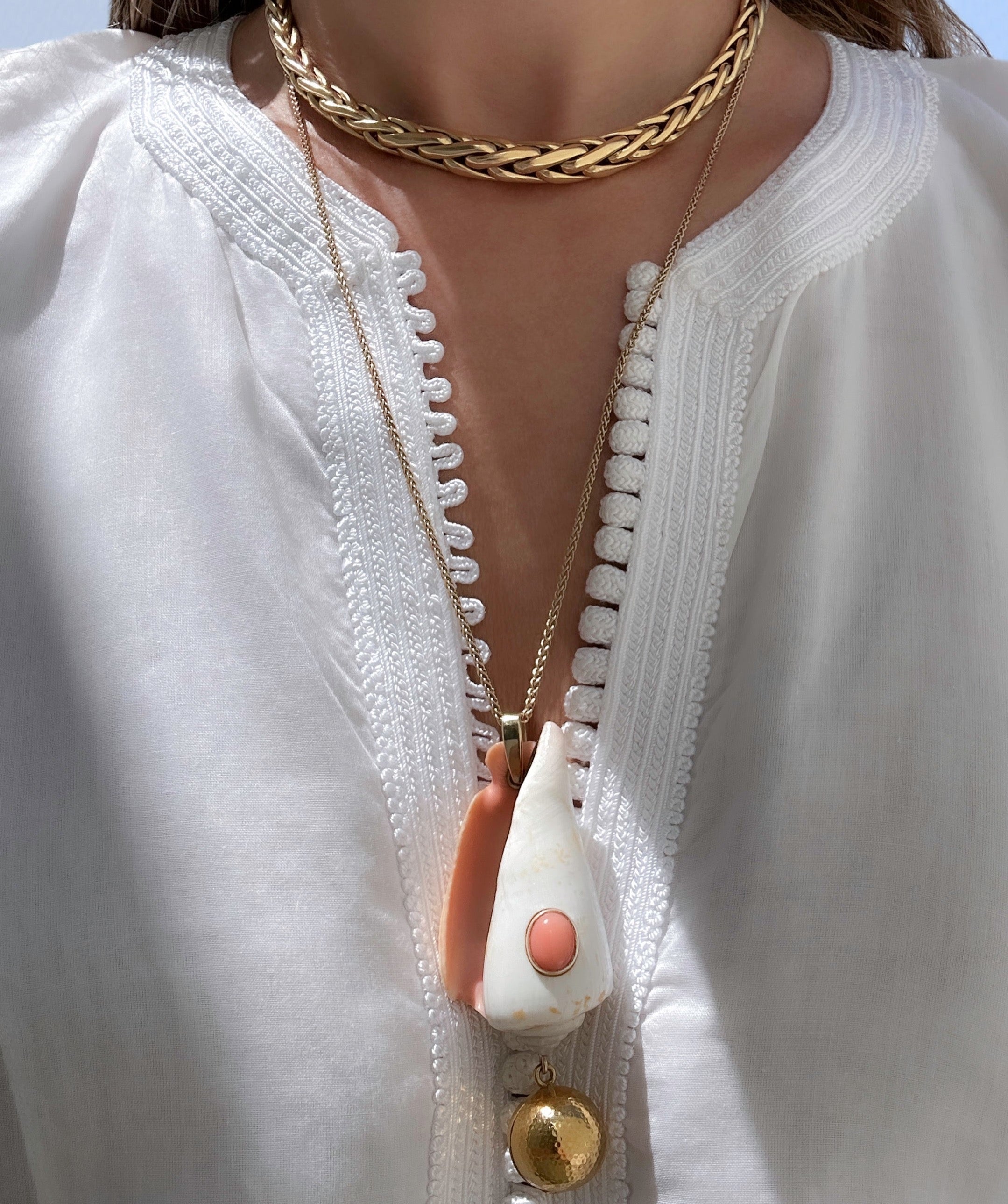 - The antique hammered gold plated sphere keepsake dangles from a shell. The pinkish shell is adorned with an oval coral cabochon set in gold. The keepsake measures approx. 0.7" diameter (17mm). The whole pendant is approx. 3 1/4" (84mm) long and hangs from a 22" (56cm) wheat style 14k gold chain. The total necklace is approx. 25 1/2"long. Size Chart