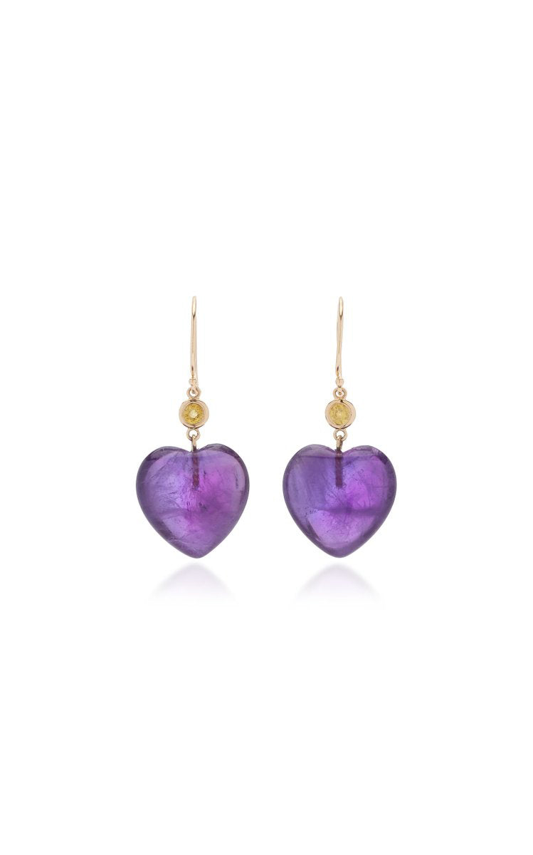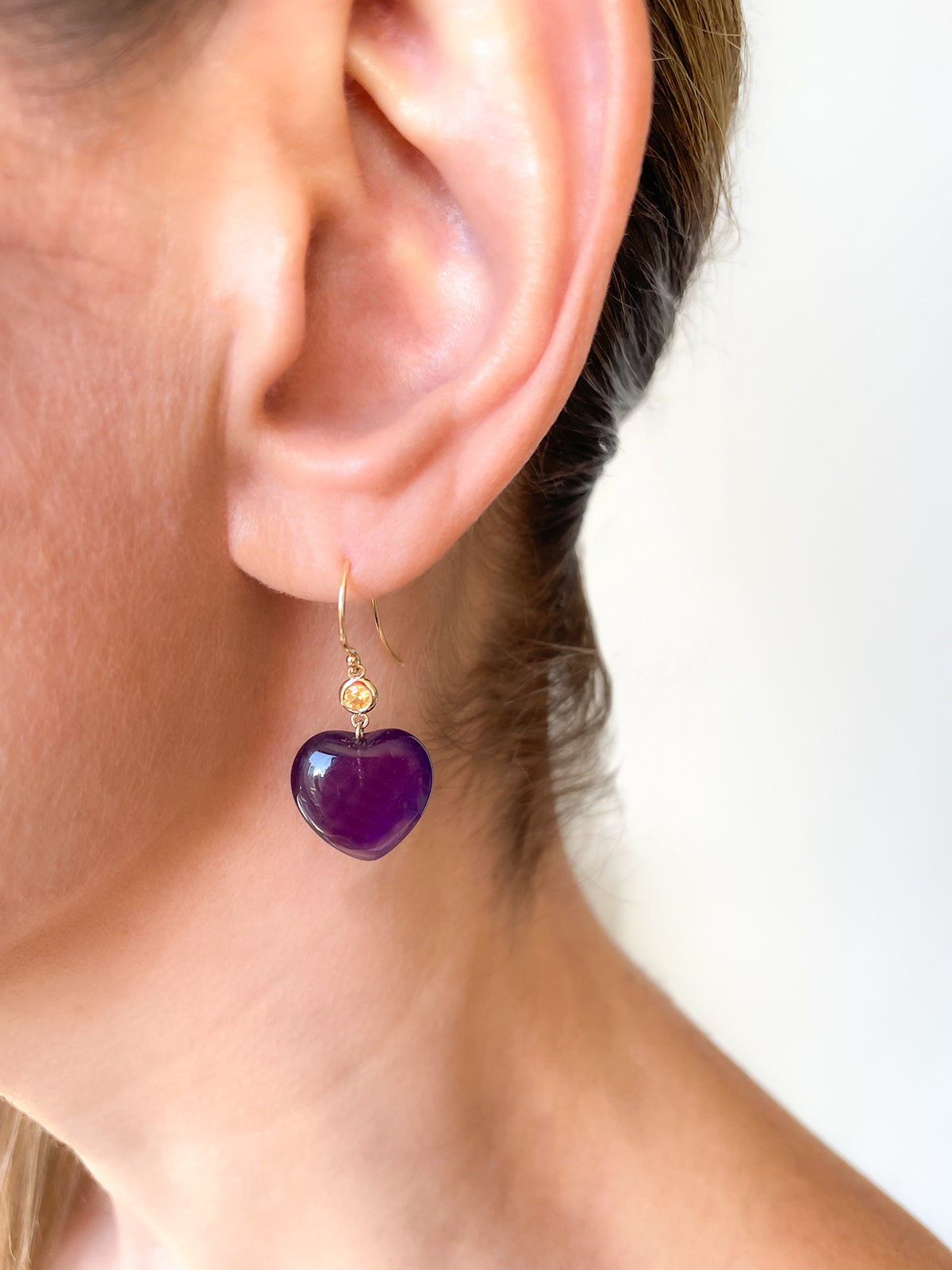 Celebrate love with amethyst a stone of peace and unification. 14k yellow gold Amethyst Yellow sapphire Available Hand-carved in NYC Style 030420 Size & Fit Dangling mini hearts with sapphire on 14k gold fish hooks. The heart earrings measure approx. 1 1/4" long. Please note...Read more