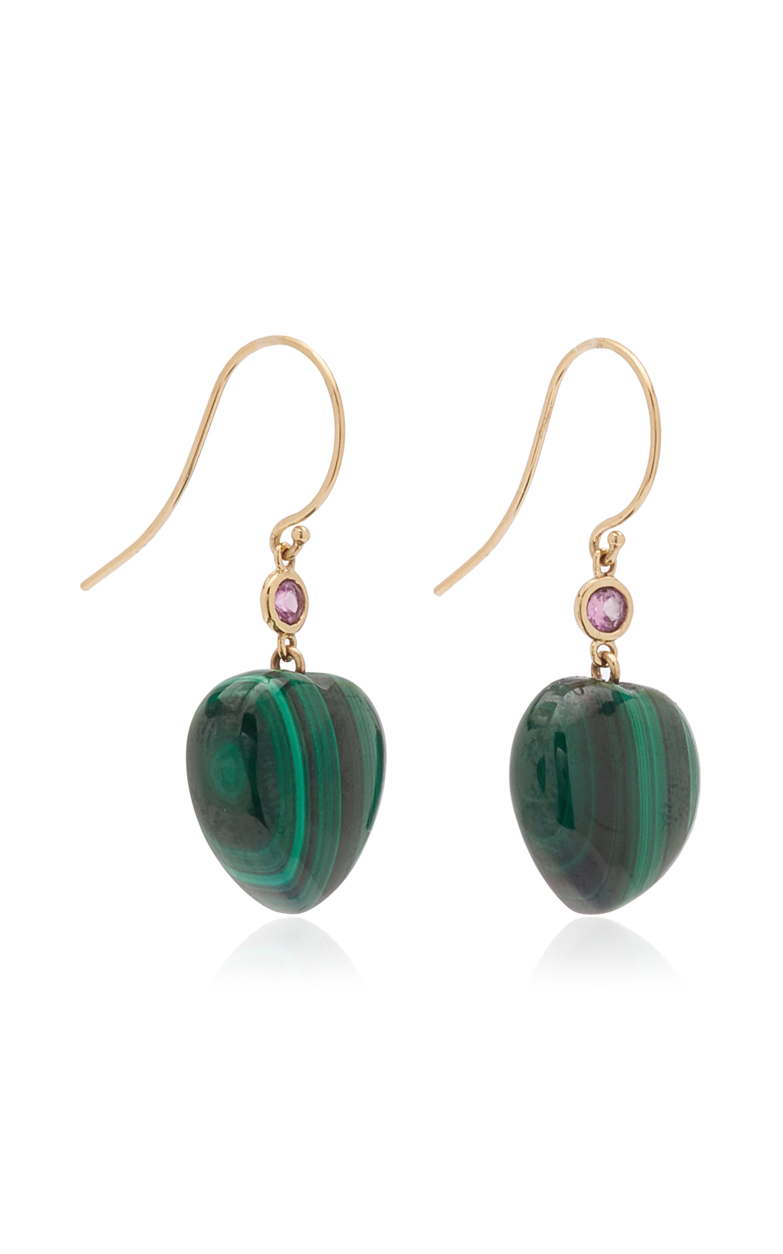 Celebrate love with malachite a stone of transformation and joy. 14k yellow gold Malachite Pink sapphire Available Hand-carved in NYC Style 030412 Size & Fit Dangling mini hearts with sapphires on 14k gold fish hooks. The heart earrings measure approx. 1 1/4" long. Please note...Read more