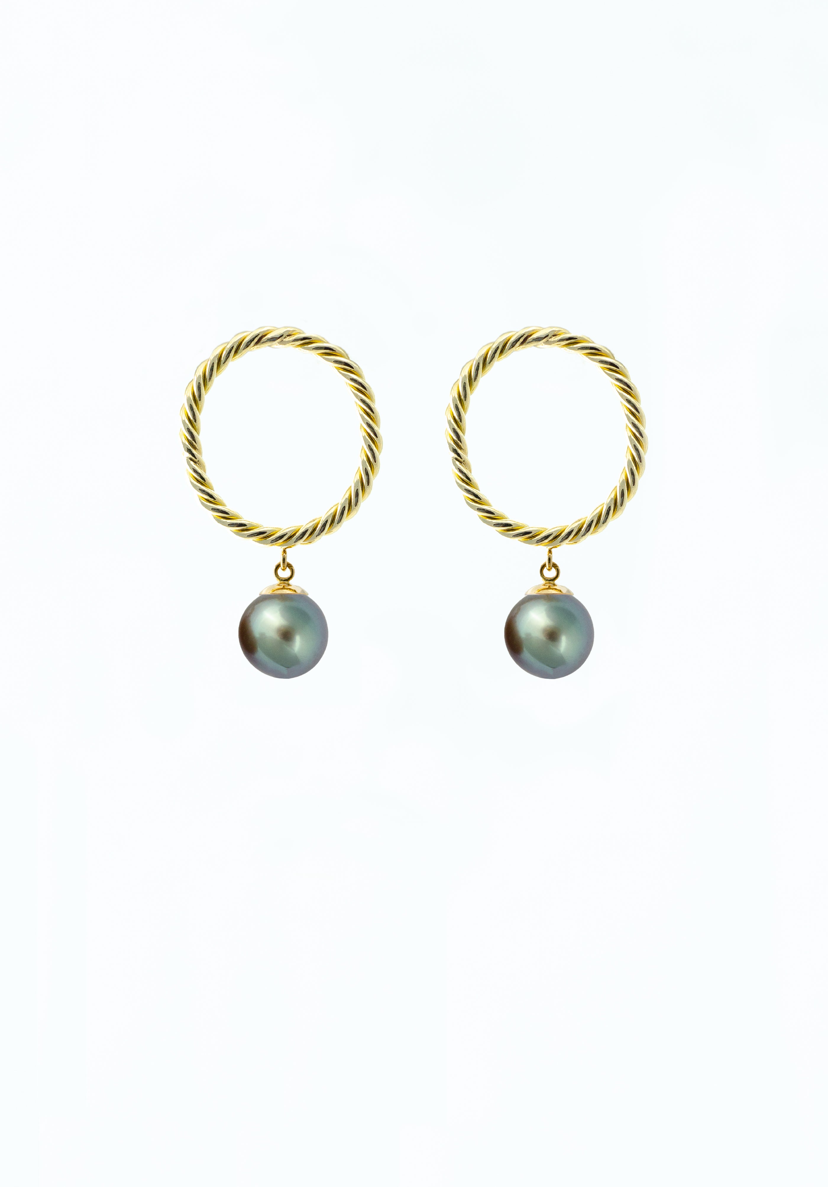- A hand-twisted gold oval shape paired with dangling Tahitian pearls measuring 9mm in diameter. The oval shape is approx. 3/4" x 5/8" (2x2.2cm). Size Chart