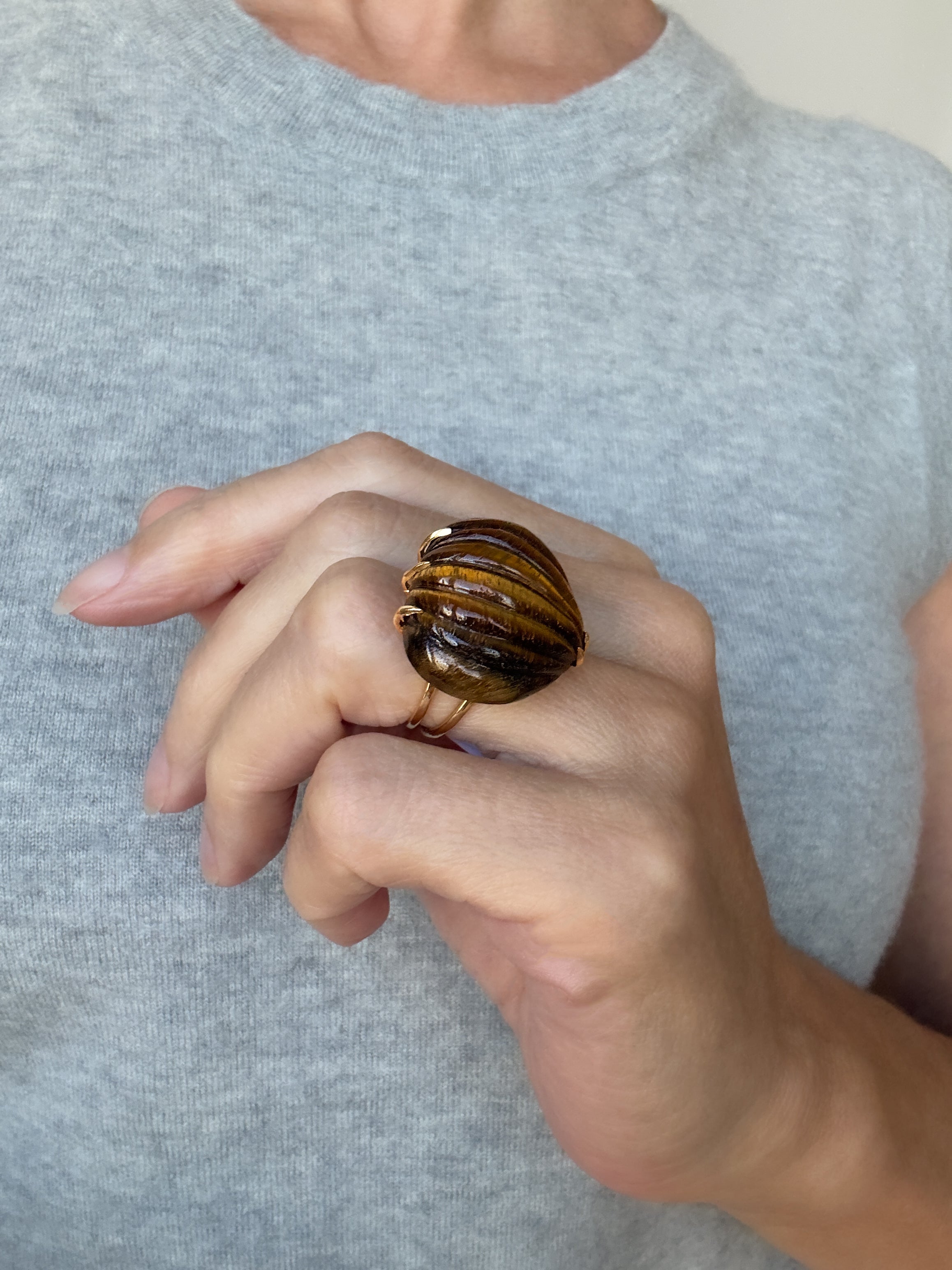 Tiger's Eye Carved Fluted Heart Gold Ring