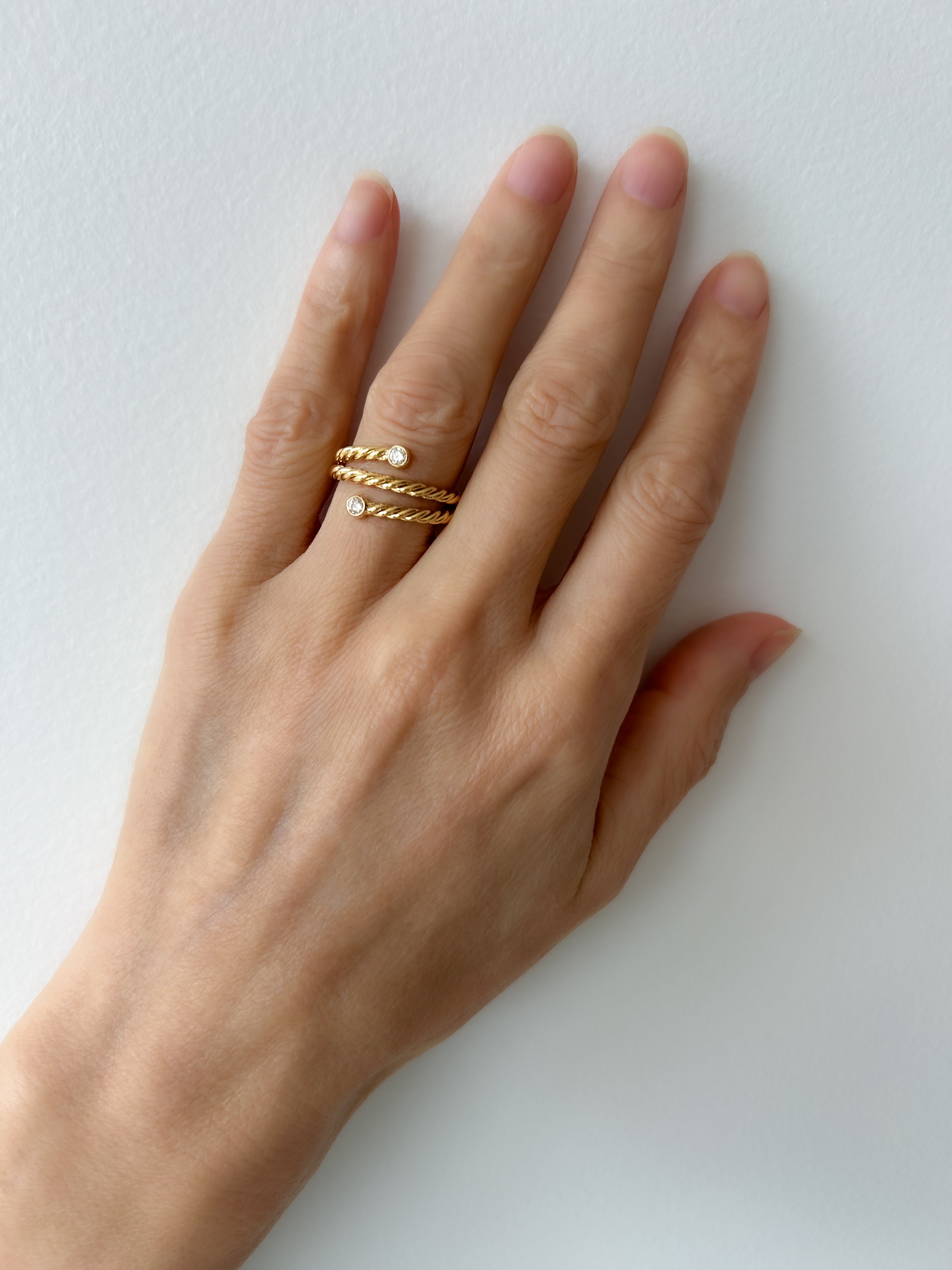 The hand twisted gold ring paired with diamonds is a classical take on the Toi et Moi ring.