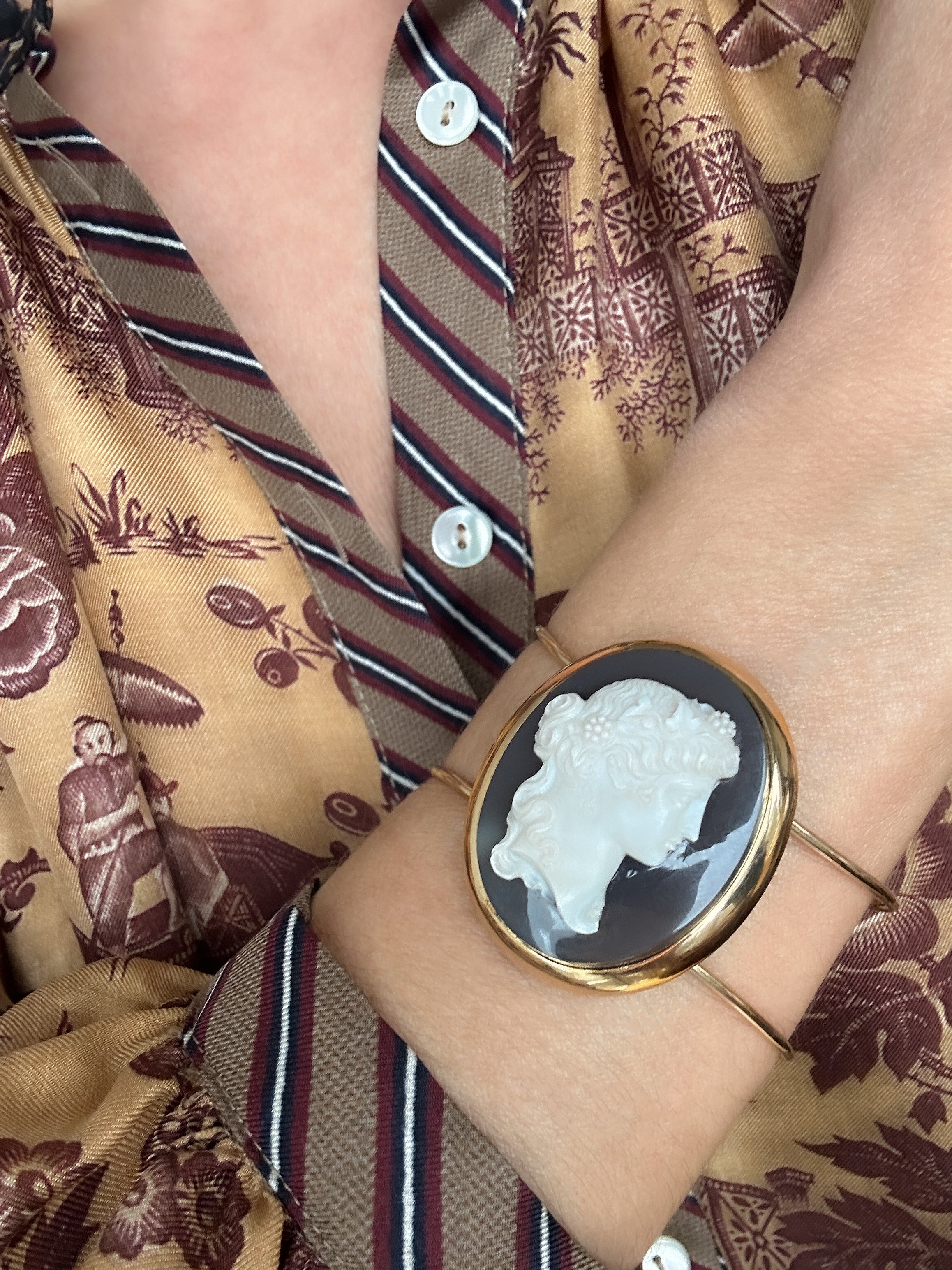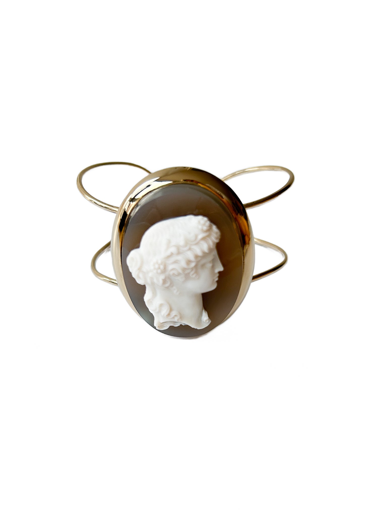 A 19th century oval agate cameo in the face of Andromeda is carved from a solid piece of agate. The cameo is set in its original 18k yellow gold bezel and mounted on wire cuff. The cameo measures ≈ 1.7"x1.4" (44mmx35mm). The cuff can be sized.  Size Chart