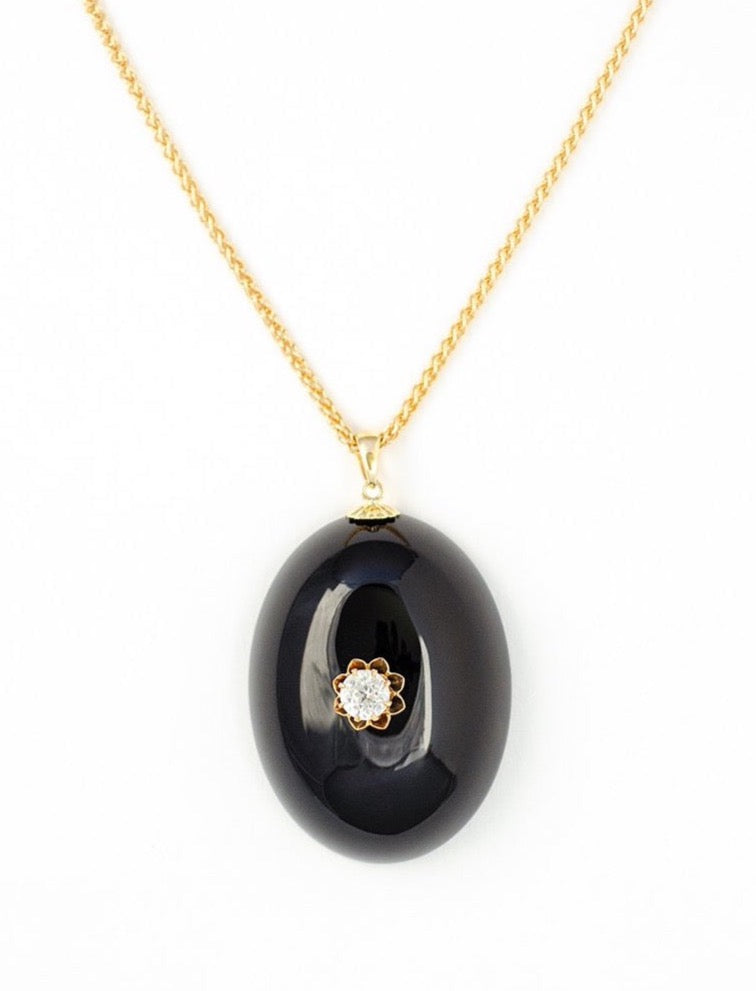 An oval onyx pendant paired with an early 1900's French synthetic sapphire set on 14k yellow gold prongs. The black onyx measures 1.2" x 1.6" (29mm x 40mm). The pendant comes without the chain.
