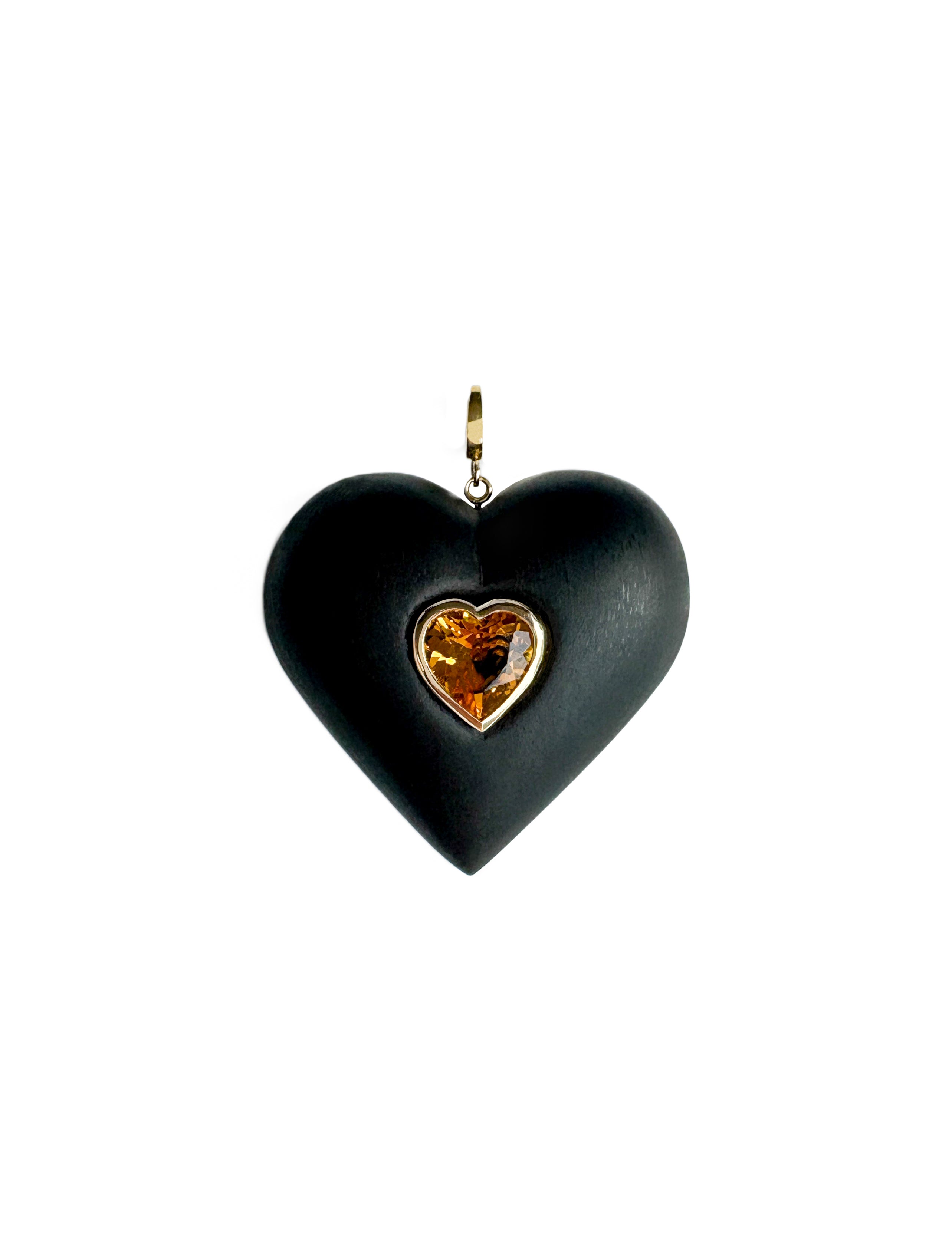 - This pendant features ebony wood paired with a heart-shaped citrine, set in 14k gold. It includes a 14k gold push clasp bail for flexible attachment options. The ebony heart measures approx. 1 5/8" x 1 1/2" (45mm x 40mm). The pendant doesn't come with a chain. Size Chart