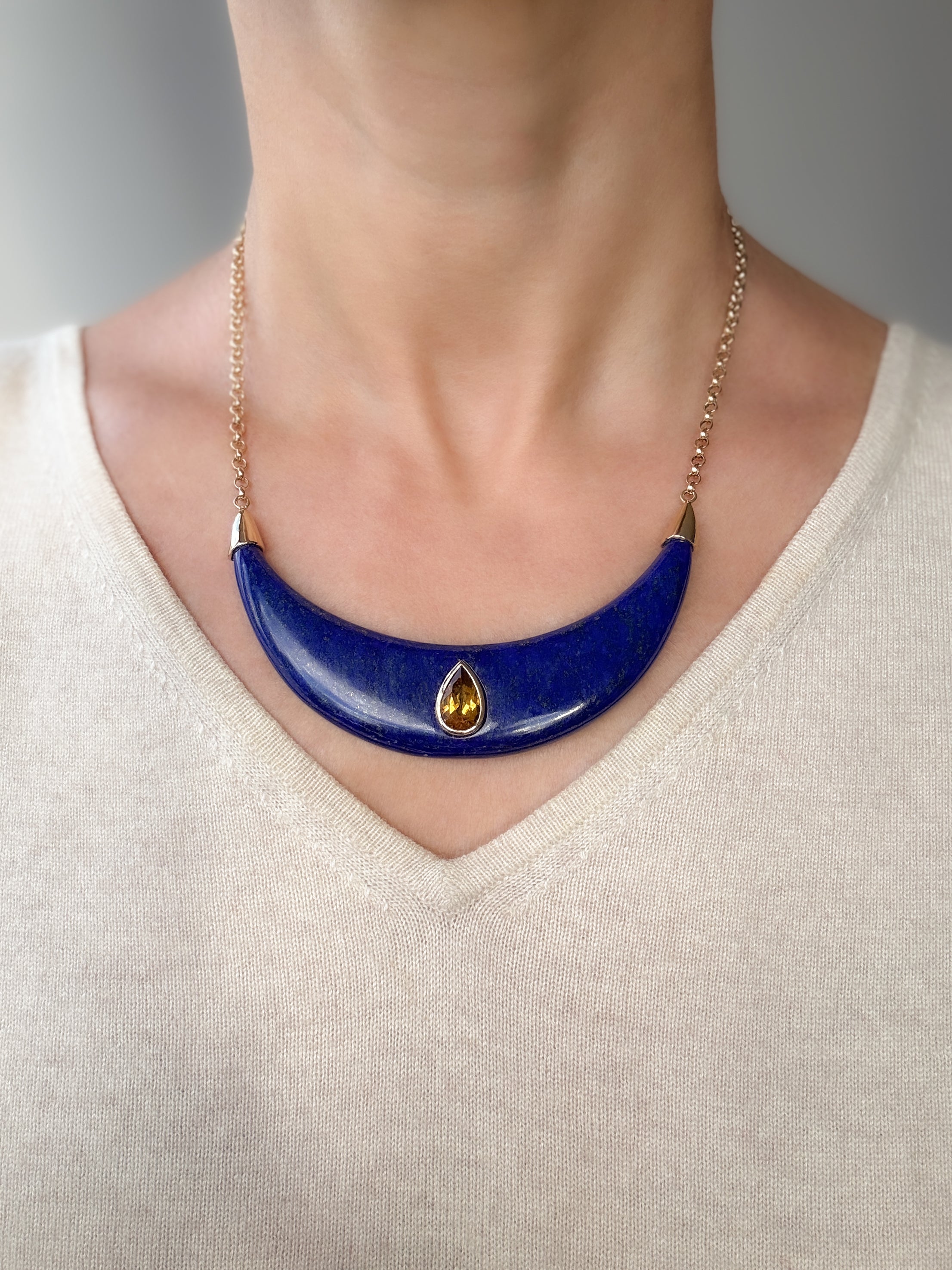 Crescent Moon Lapis & Citrine Gold Necklace