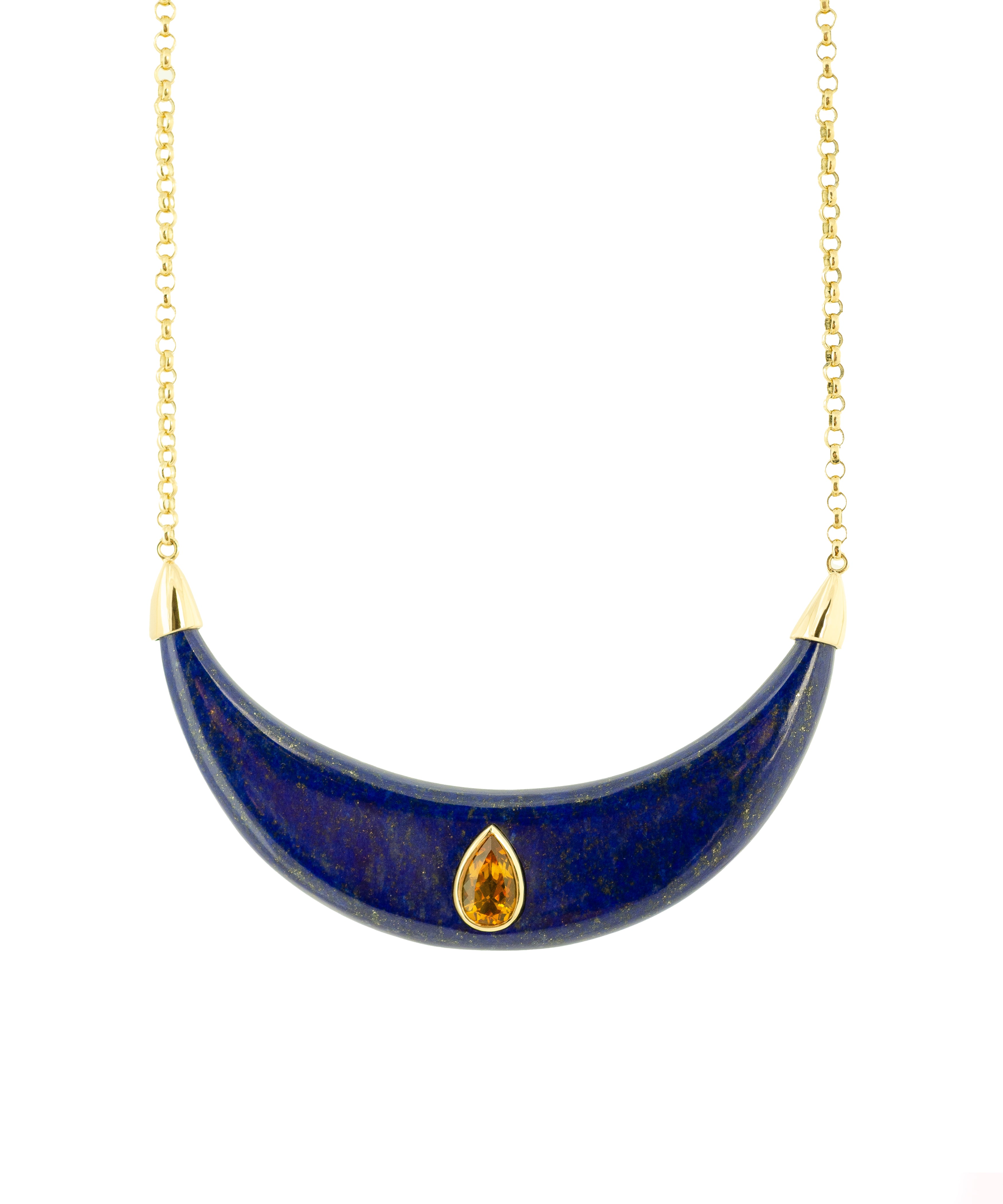 A hand carved crescent moon shaped lapis lazuli is adorned in its center with a drop shape citrine set in gold. It hangs from a 12" long round chain for a total length of 16". Size Chart