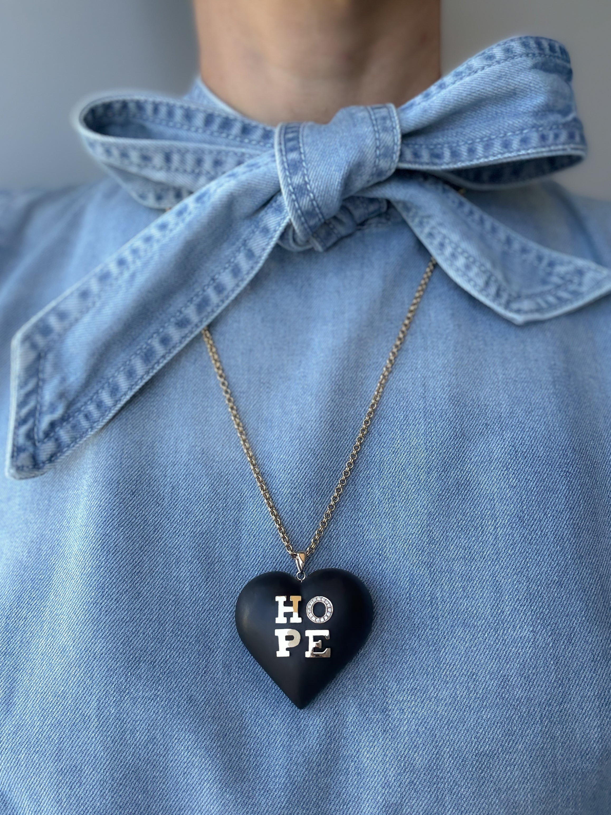 This ebony wood heart is paired with 14k gold HOPE letters. The letter O is pavé-set with 14 diamonds. The heart measures approx. 1 5/8" x 1 1/2" (45mm x 40mm). The pendant doesn't come with a chain. Size Chart