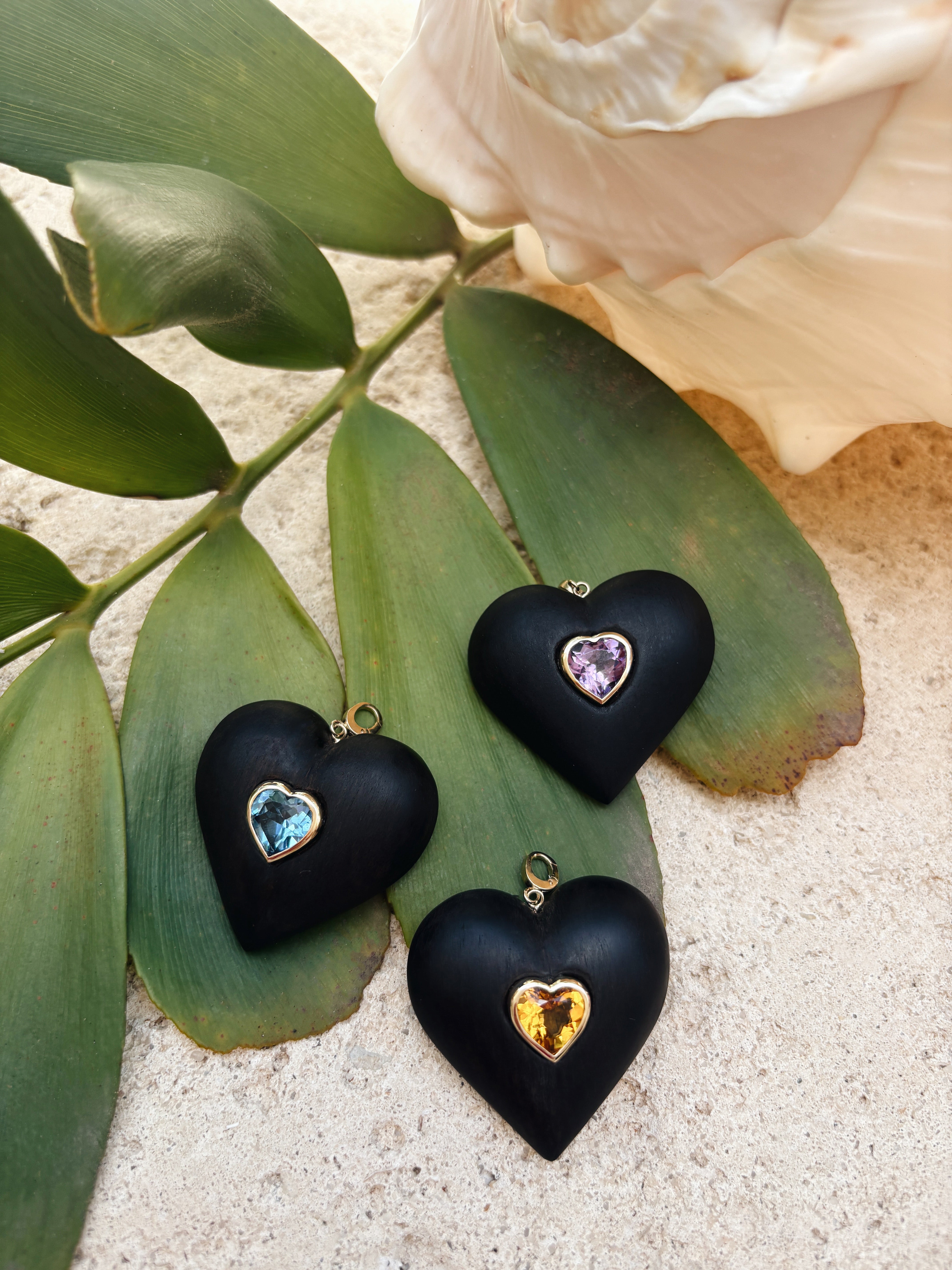 MULTI GEM 3 HEART DANGLE EARRINGS - TIGER'S EYE/AMETHYST