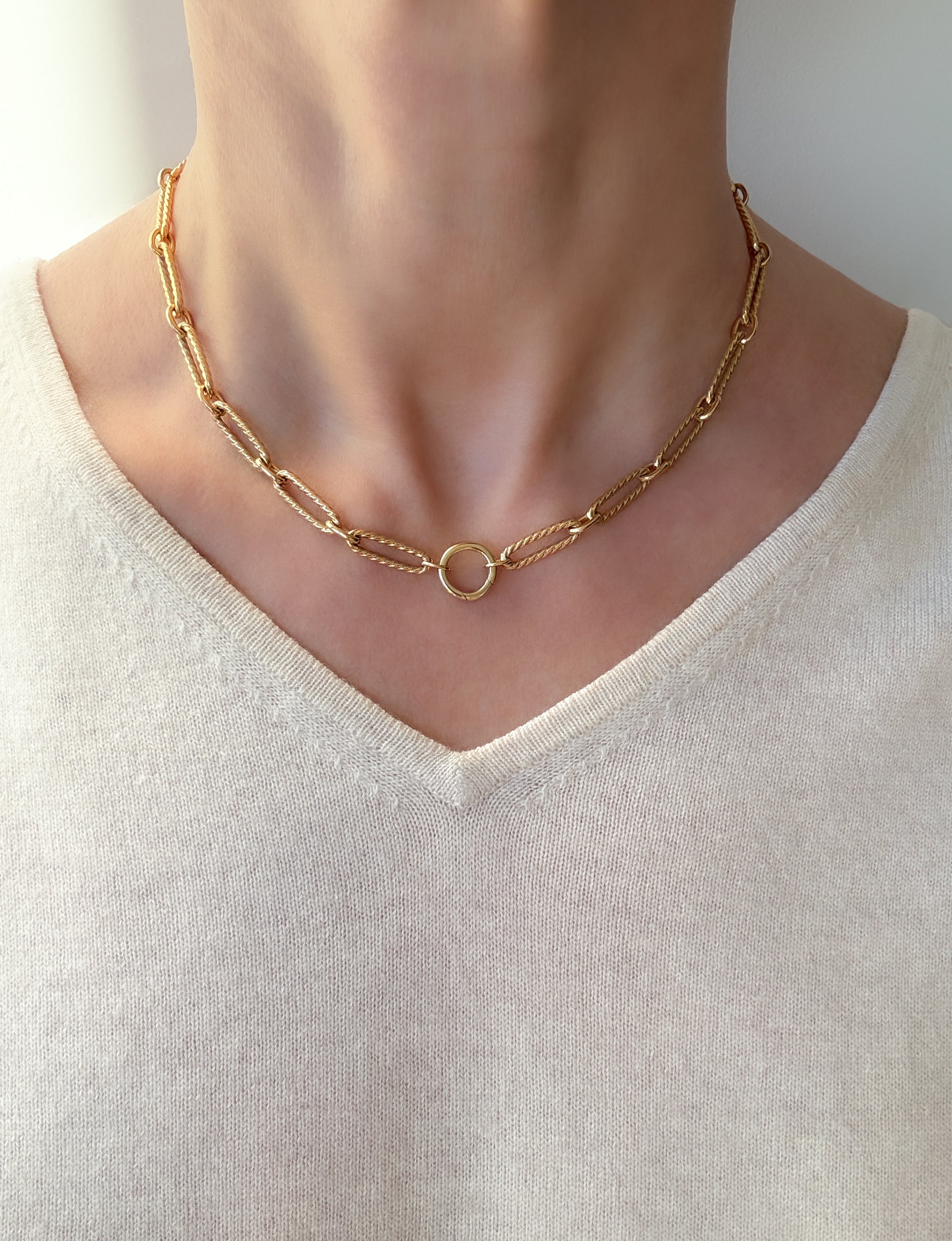 Our exclusive gold necklace comes in 3 sizes: 16" (as shown), 18" or 20". The chain comes in the front with a round push clasp to accommodate one or many pendants, that are easy to attach. The back comes with a clasp. Size Chart