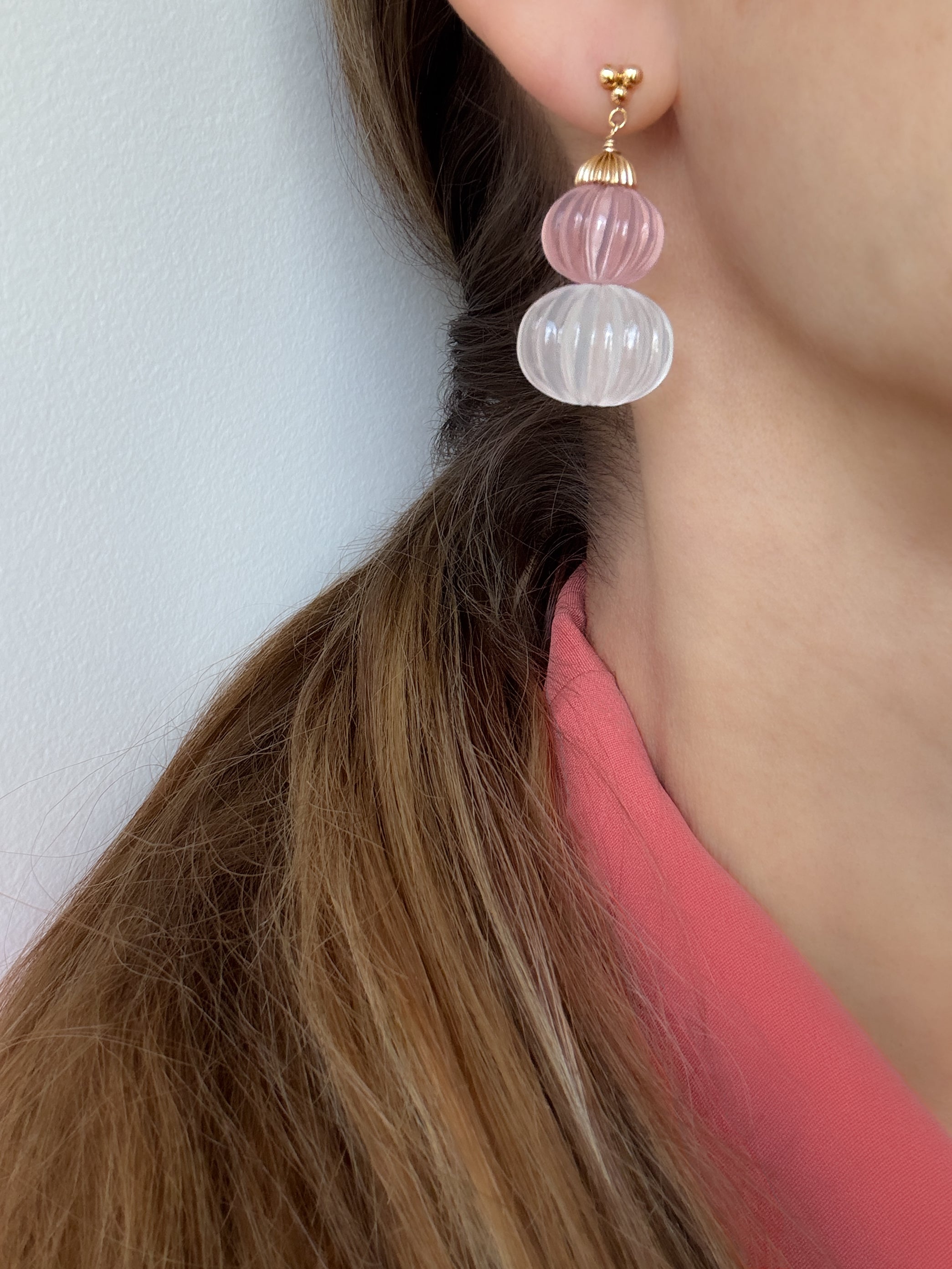 Fluted Moon & Rose Quartz, Citrine Gold Earrings