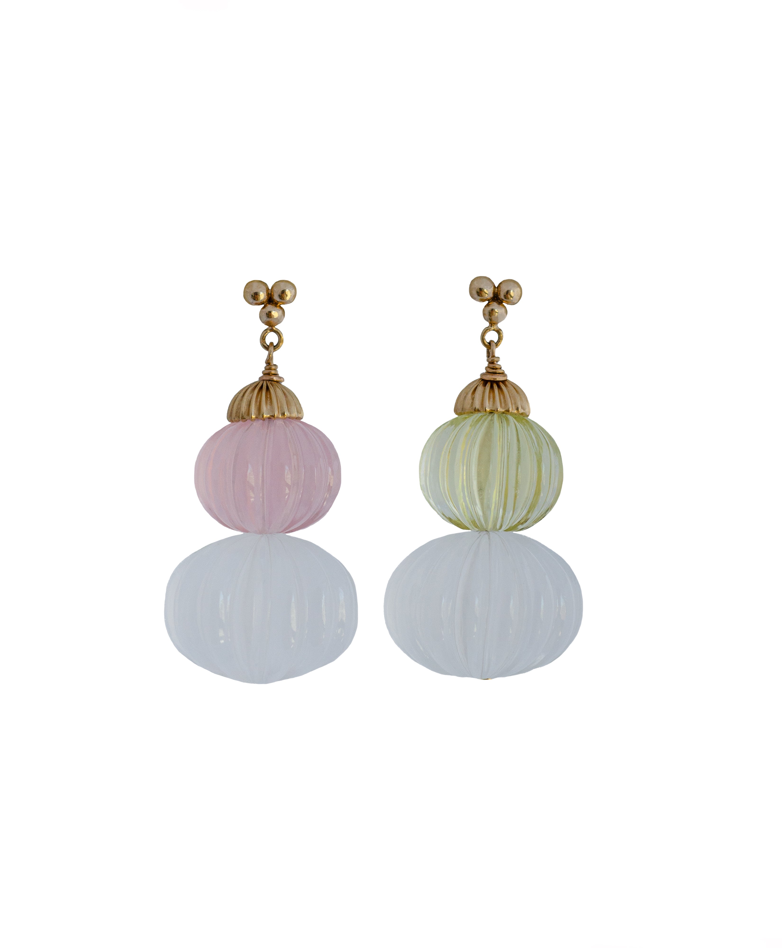 Hanging from 14k gold studs, 2 fluted spheres hang on each side. One side with a rose quartz, the other with a lemon citrine. The total length is 1 9/16" (50mm). Size Chart