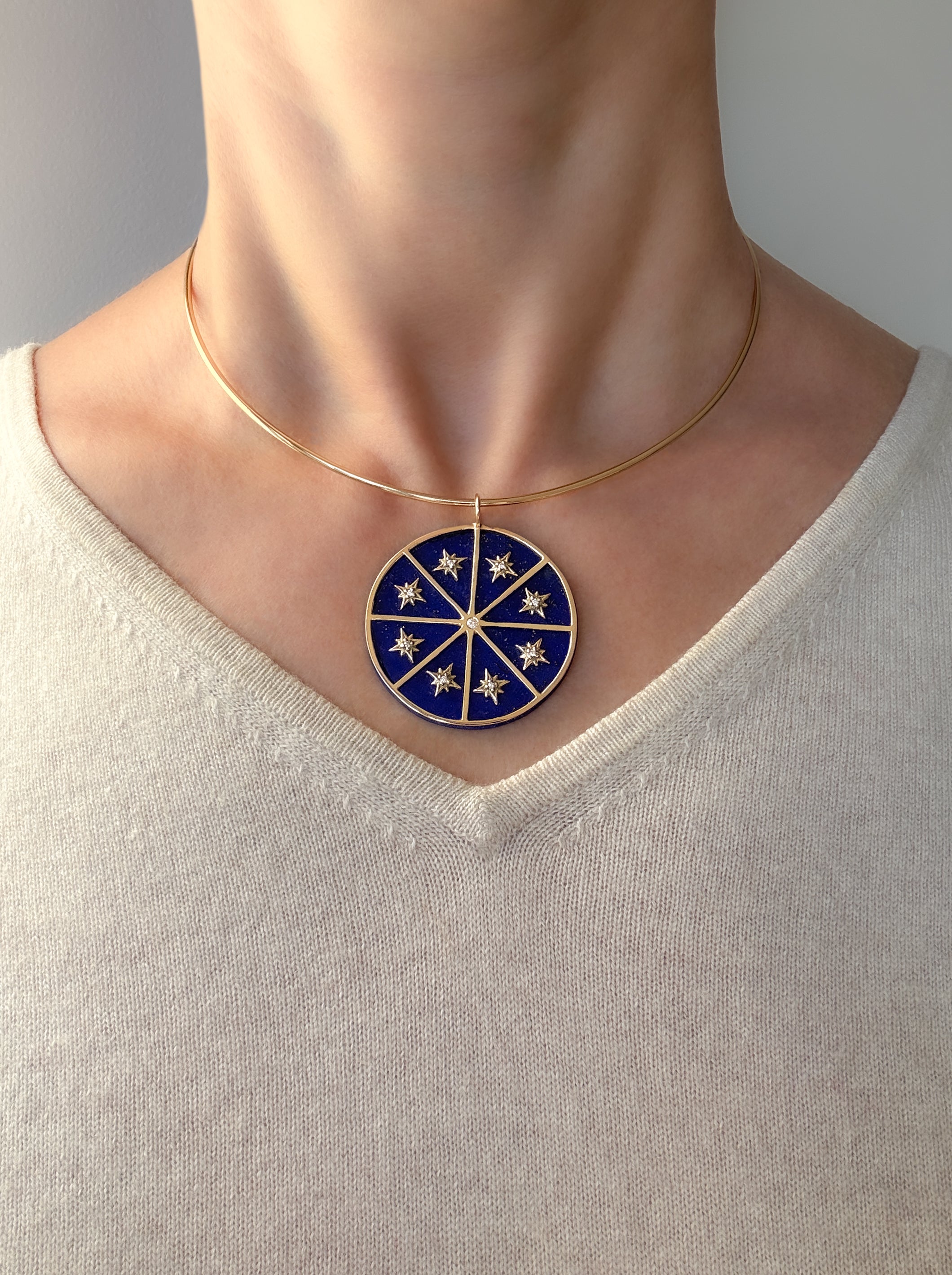 This pendant represents the Sun and the eight planets gravitating around it. 18k yellow gold Lapis lazuli Diamonds 0.1 TCW Available Carved in NYC Style #010216 Size & Fit This pendant features a lapis lazuli disc measuring 1...Read more