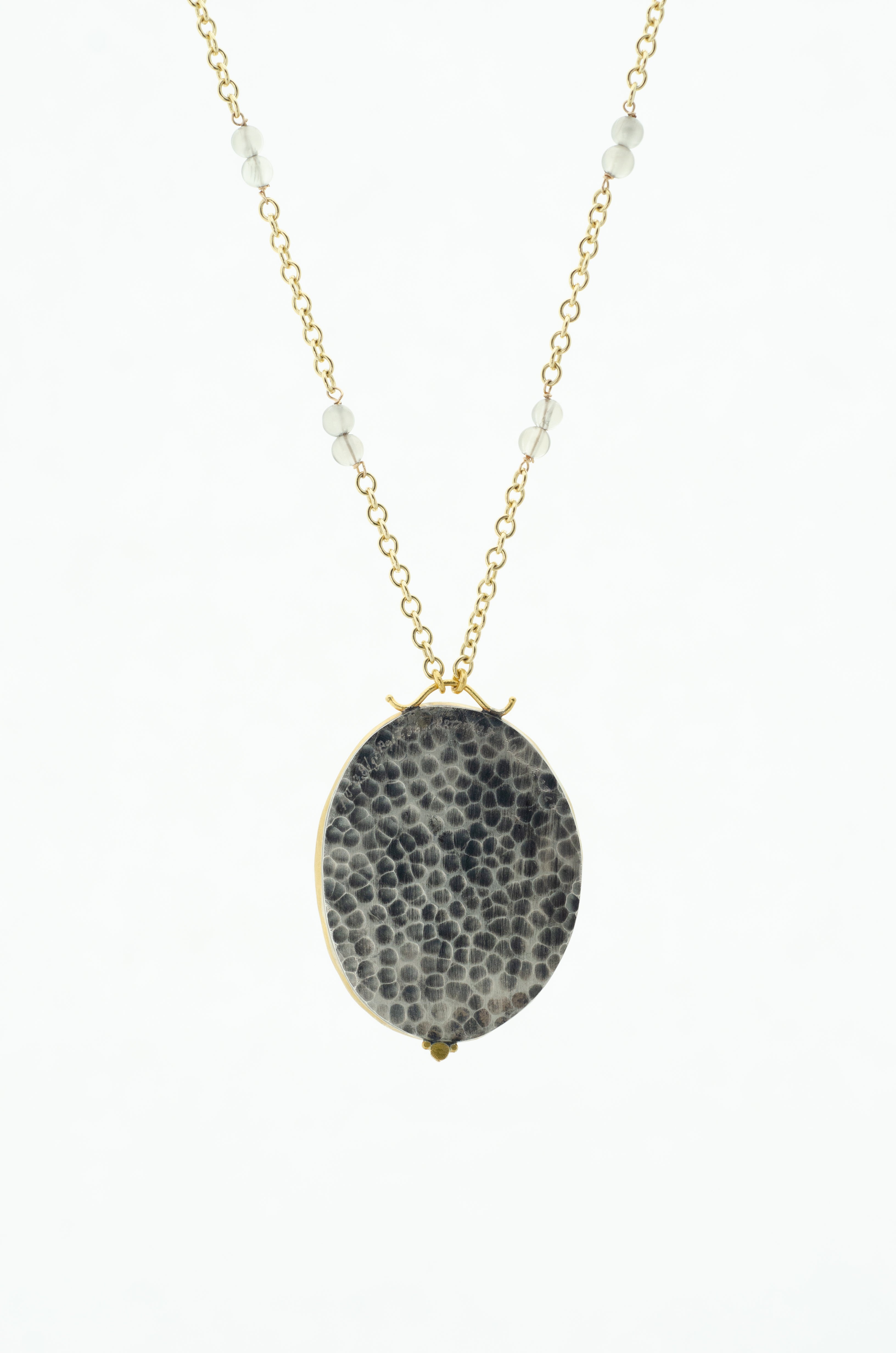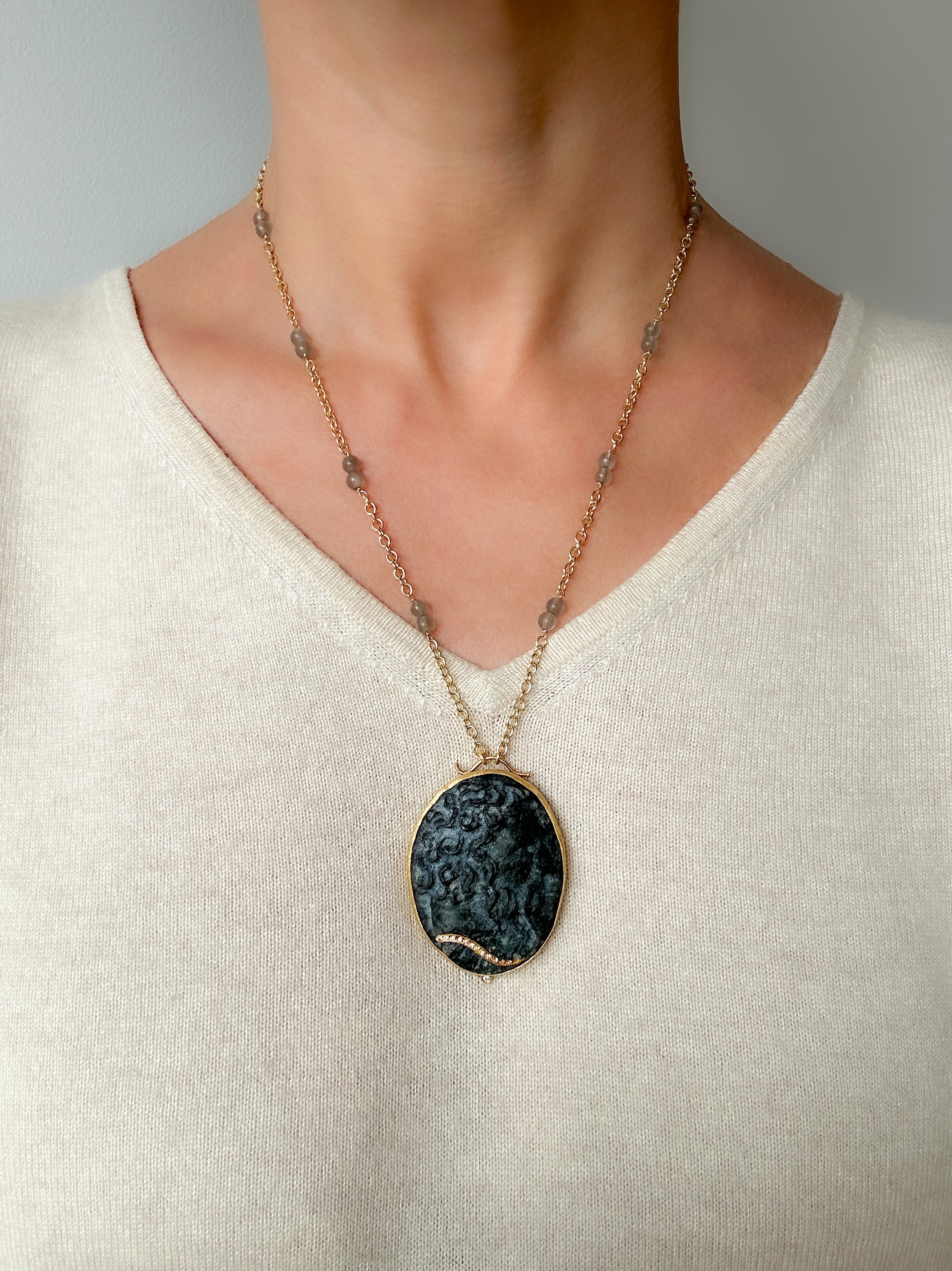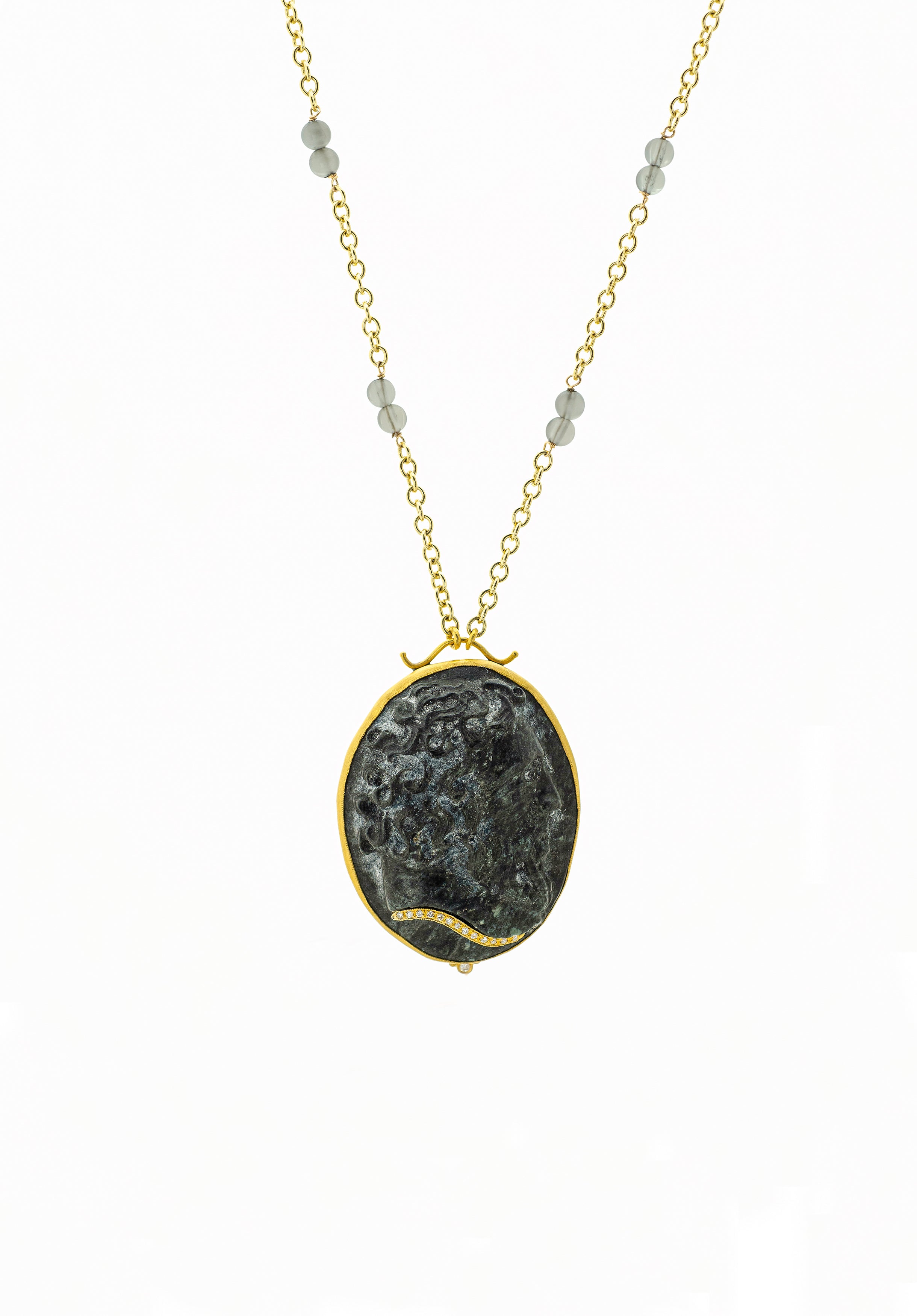 - The cameo is carved in hematite and set in 24k gold with a hammered S/S back and underlined with a gold strip of 13 round cut diamonds. The 18k gold chain with moonstone beads is finished with a lobster clasp. The cameo is approx. 1 3/4"x1 1/2" (5x3.5cm). The gold chain is 19" (48cm) long and the total length is 24" (60cm). Size Chart