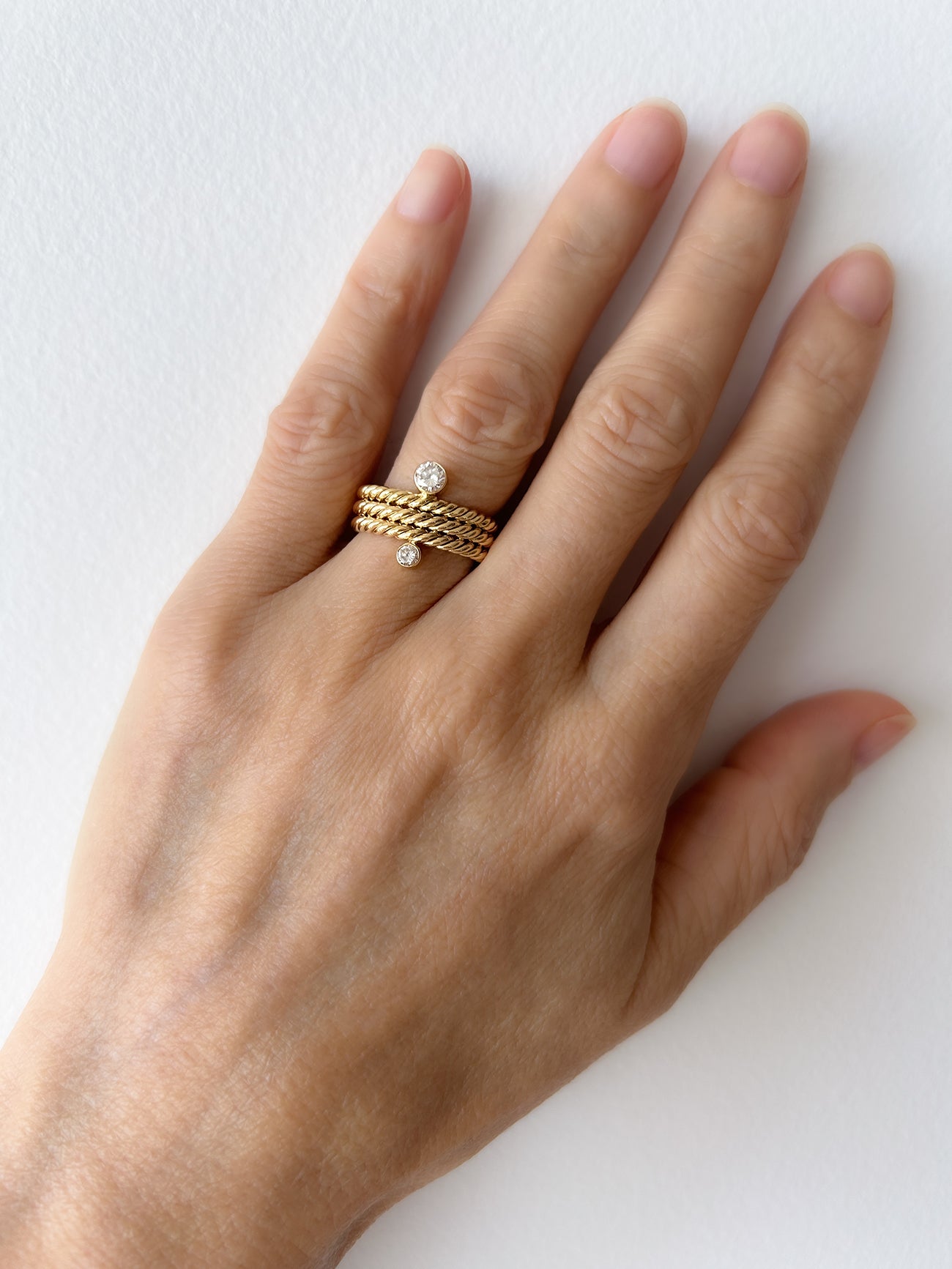 - 3 hand twisted stacked bands come with two round cut white diamonds at opposite sides, size 4mm & 2.9mm and set in bezels. Size Chart